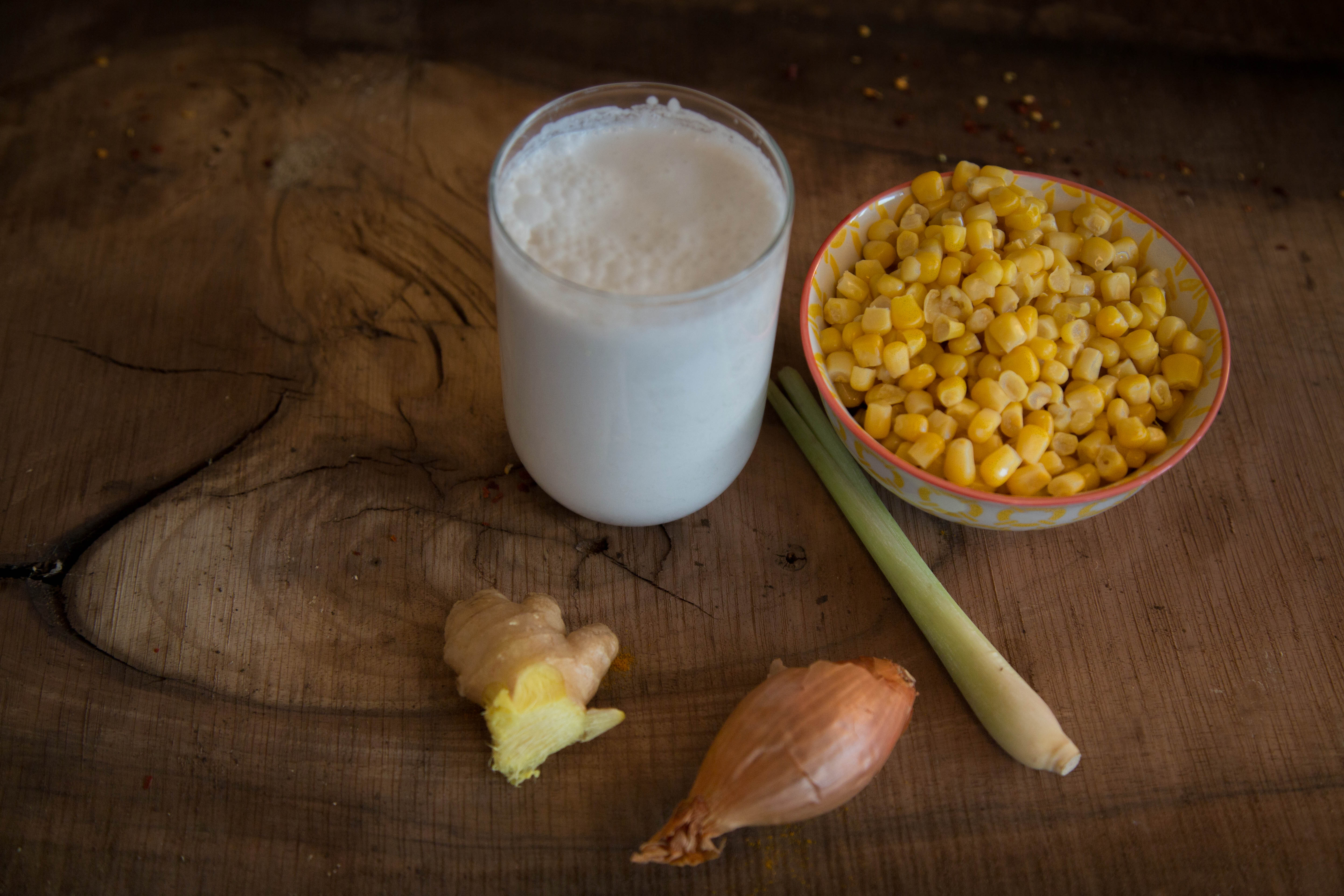 In grossem Eisengusstopf die gehackte Schalotte, die Gewürze und den Ginger in wenig Öl anziehen. Mit Weisswein ablöschen und auf die Hälfte reduzieren. Dann die Kokosmilch und etwas Bouillon dazu giessen, die Kafir Blätter und das Zitronengras, sowie Maiskörner beigeben. 10 Min köcheln lassen. Um den vollen Geschmack des Zitronengras herauszuholen, den Stängeln von unten her in der Mitte teilen (nicht den ganzen Stängel). Dann mit der Seite des Messers zerdrücken.