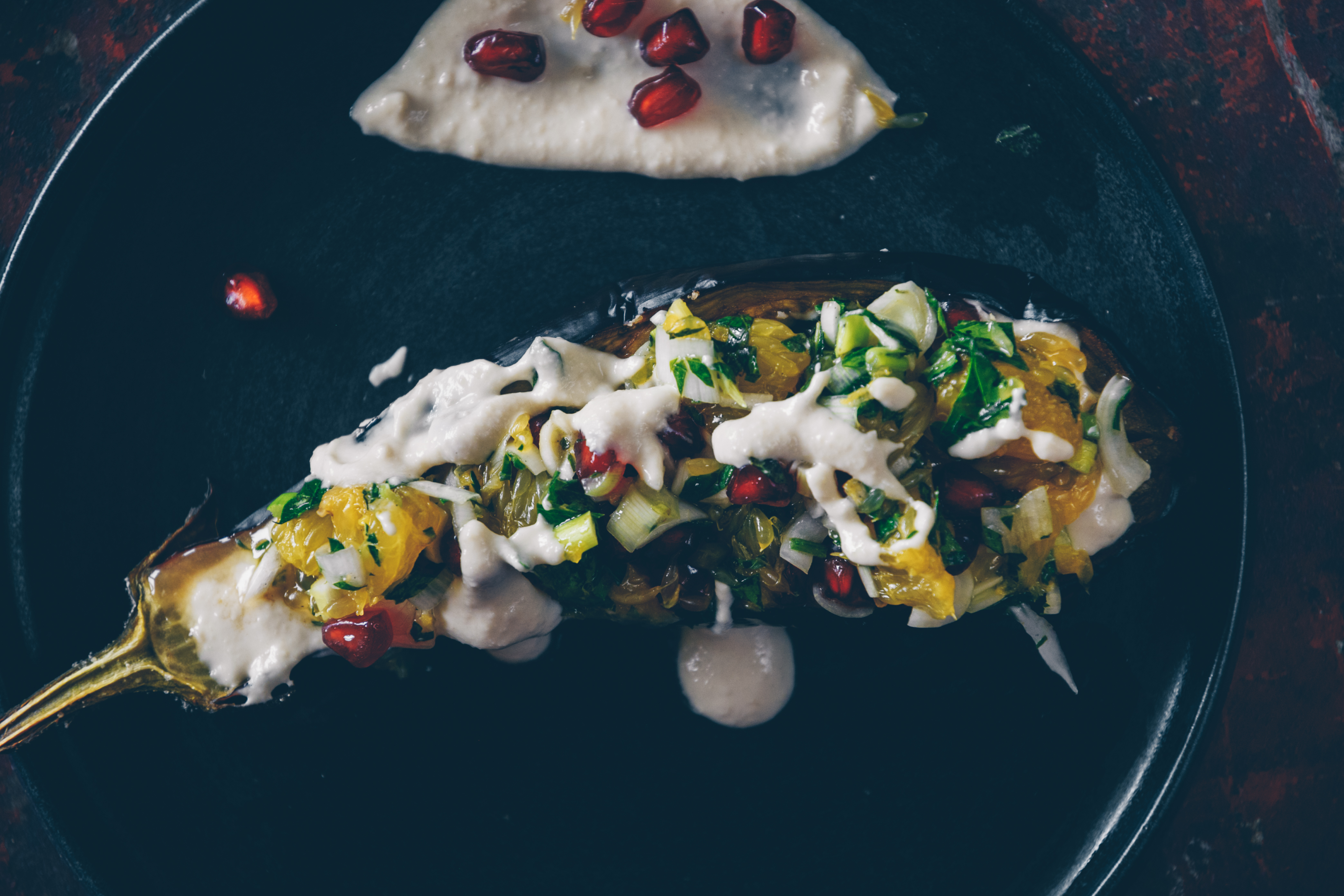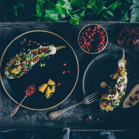 Gebackene Aubergine mit einem Granatapfel-Orangen Topping