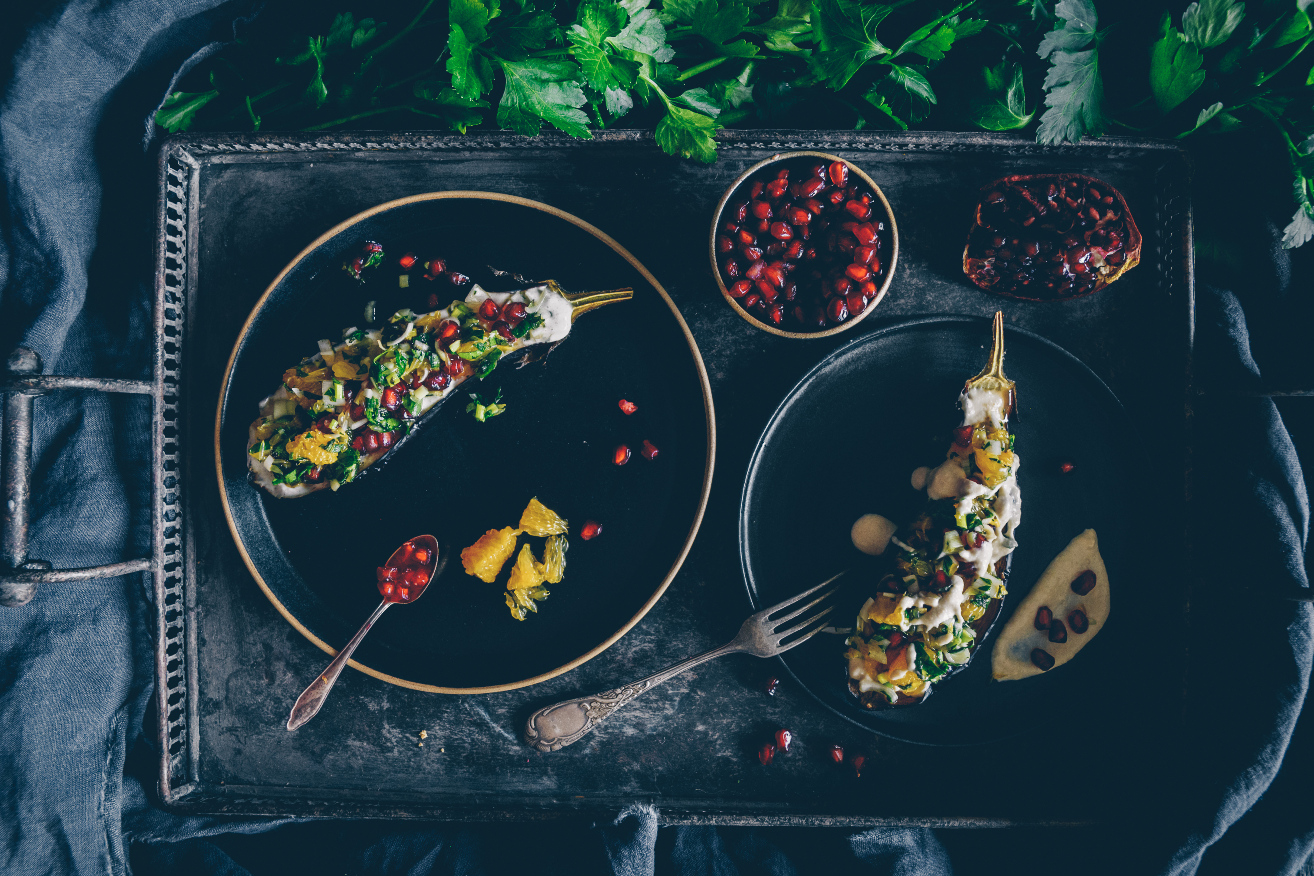 Die vielfältige Aubergine. Gebacken schmeckt sie einfach unvergleichlich und lässt sich mit Tomaten und Mozzarella genauso gut kombinieren wie mit salzig und fruchtig. Da gerade Saison für Granatapfel und Orangen ist, passt das Rezept prima in den Winter und erhellt mit dieser Geschmacksexplosion aus fruchtig, nussig & milchig hoffentlich etwas unsere Gemüter in diesem langen Corona-Winter.