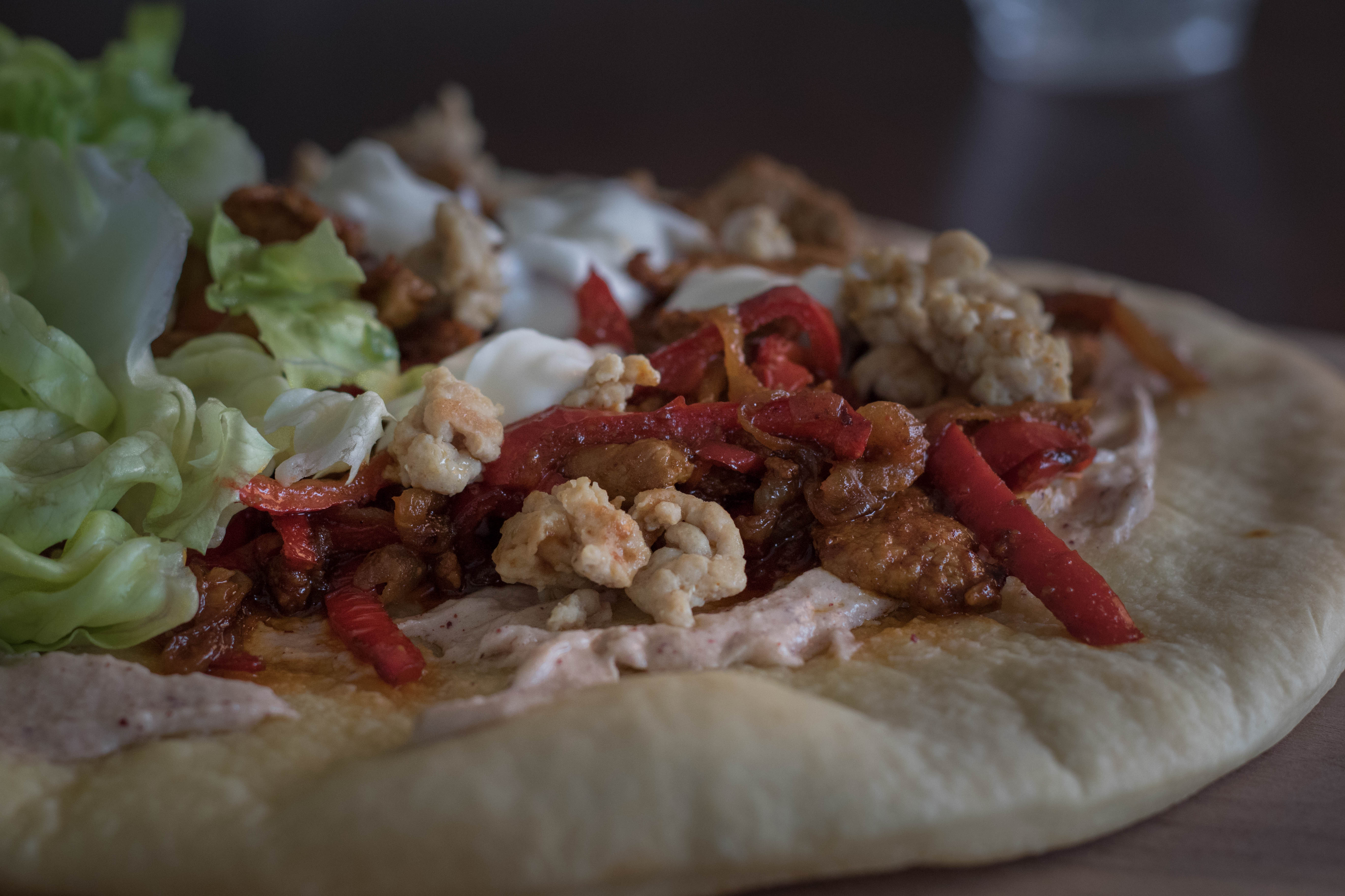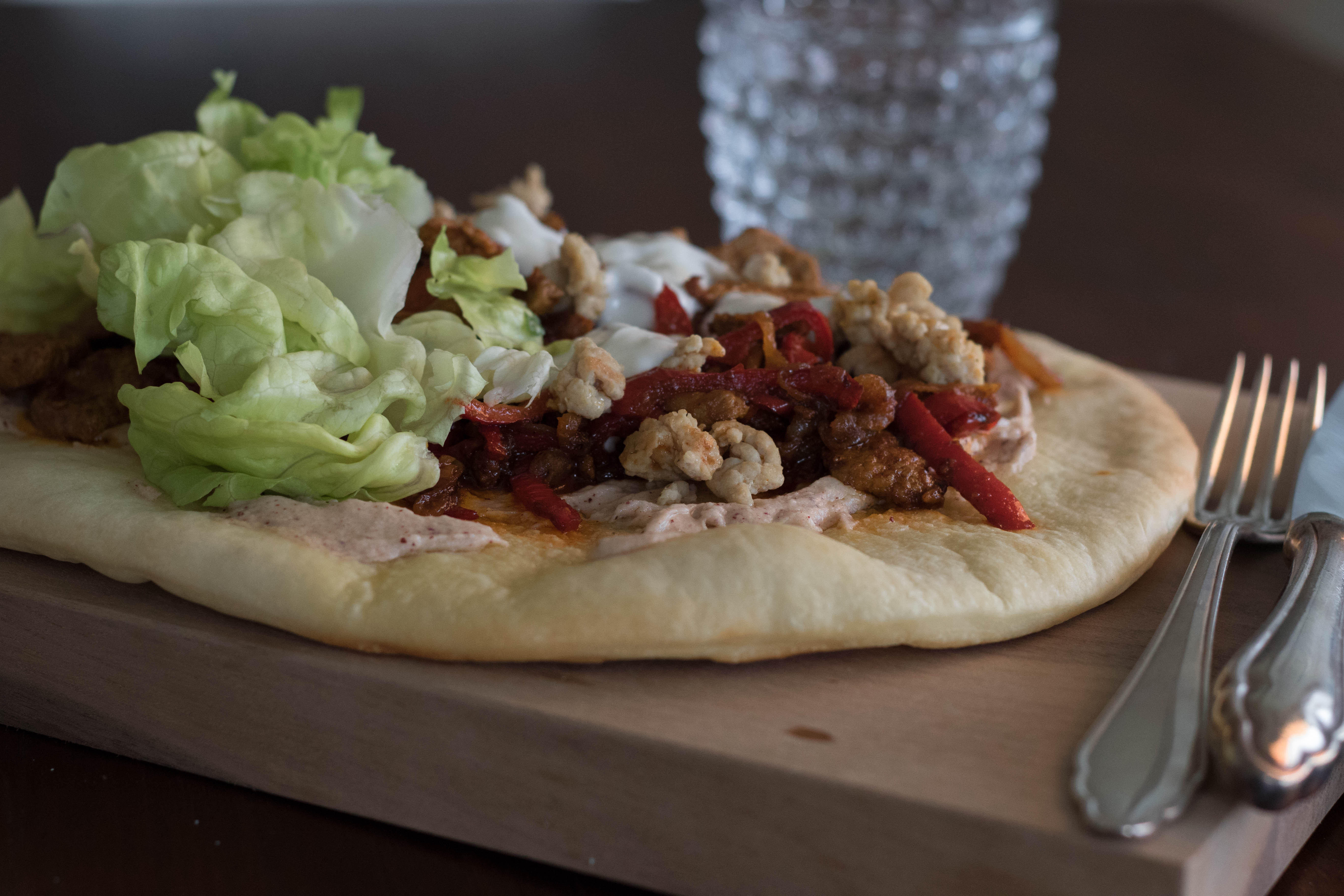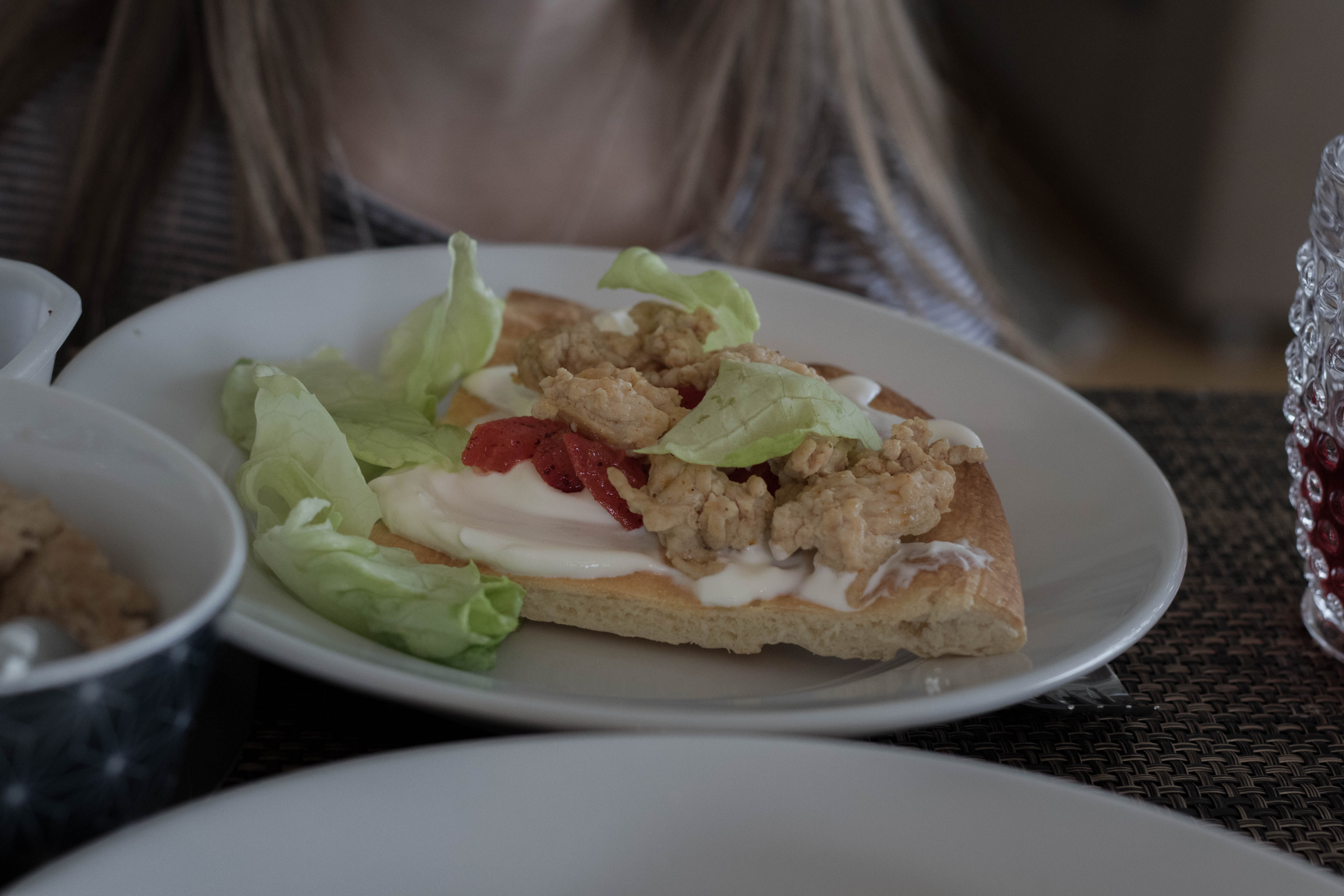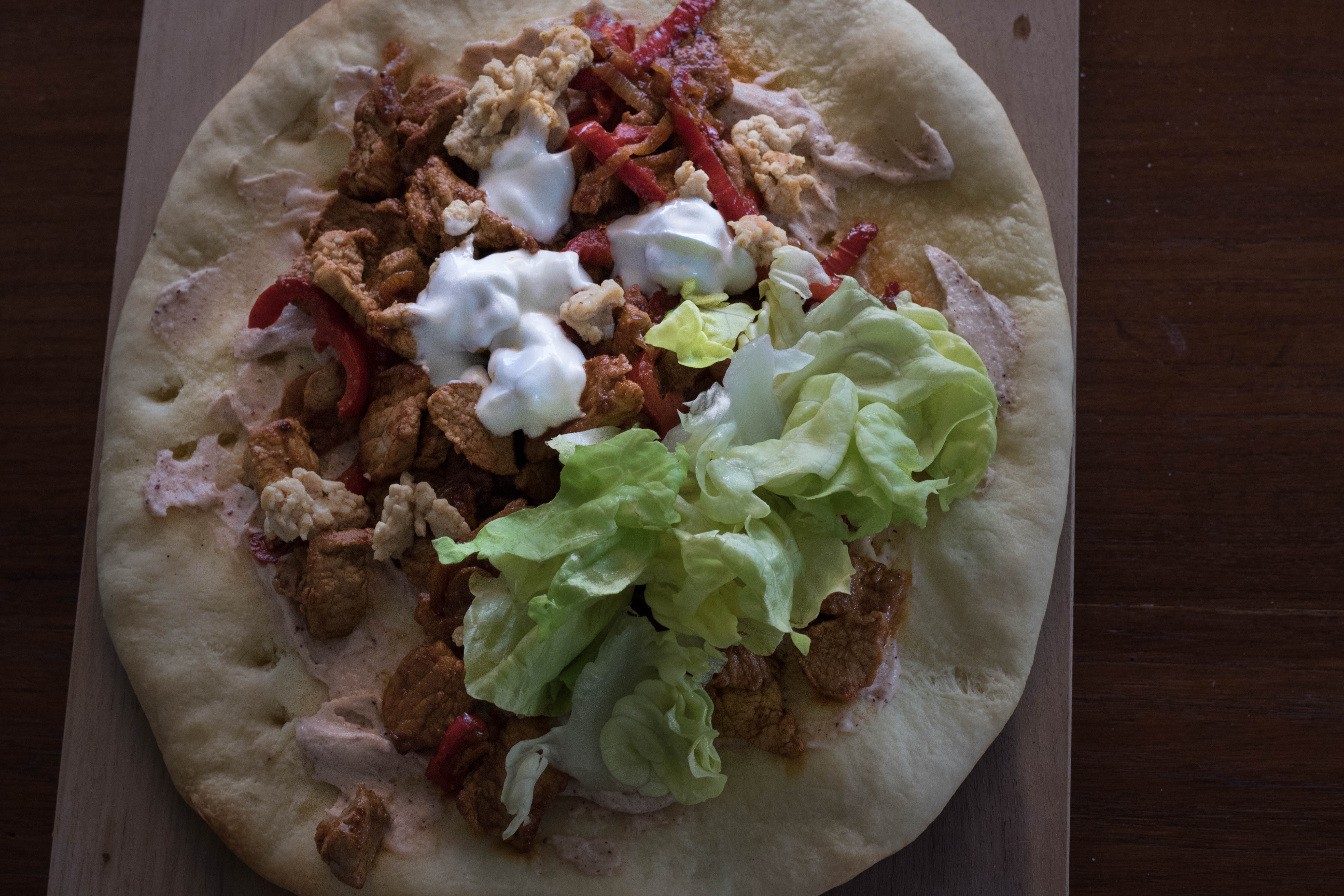 Statt Tahina wird die Version für Fräulein Tochter mit griechischem Jogurt bestrichen und mit dem gehackten Poulet, Tomatensalat und grünem Salat belegt.