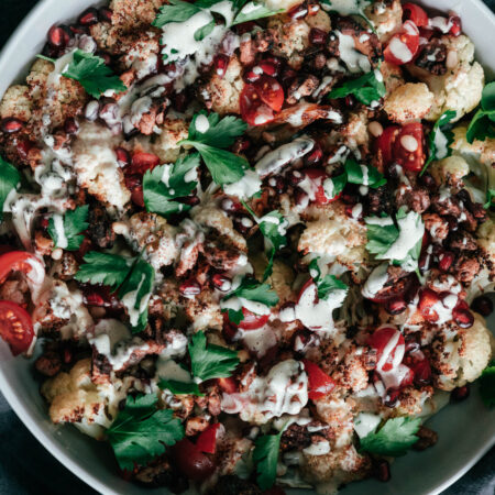 Blumenkohl, Tomaten, Granatapfel, Kräuter, Nüsse an Tahini-Zitronen-Dressing