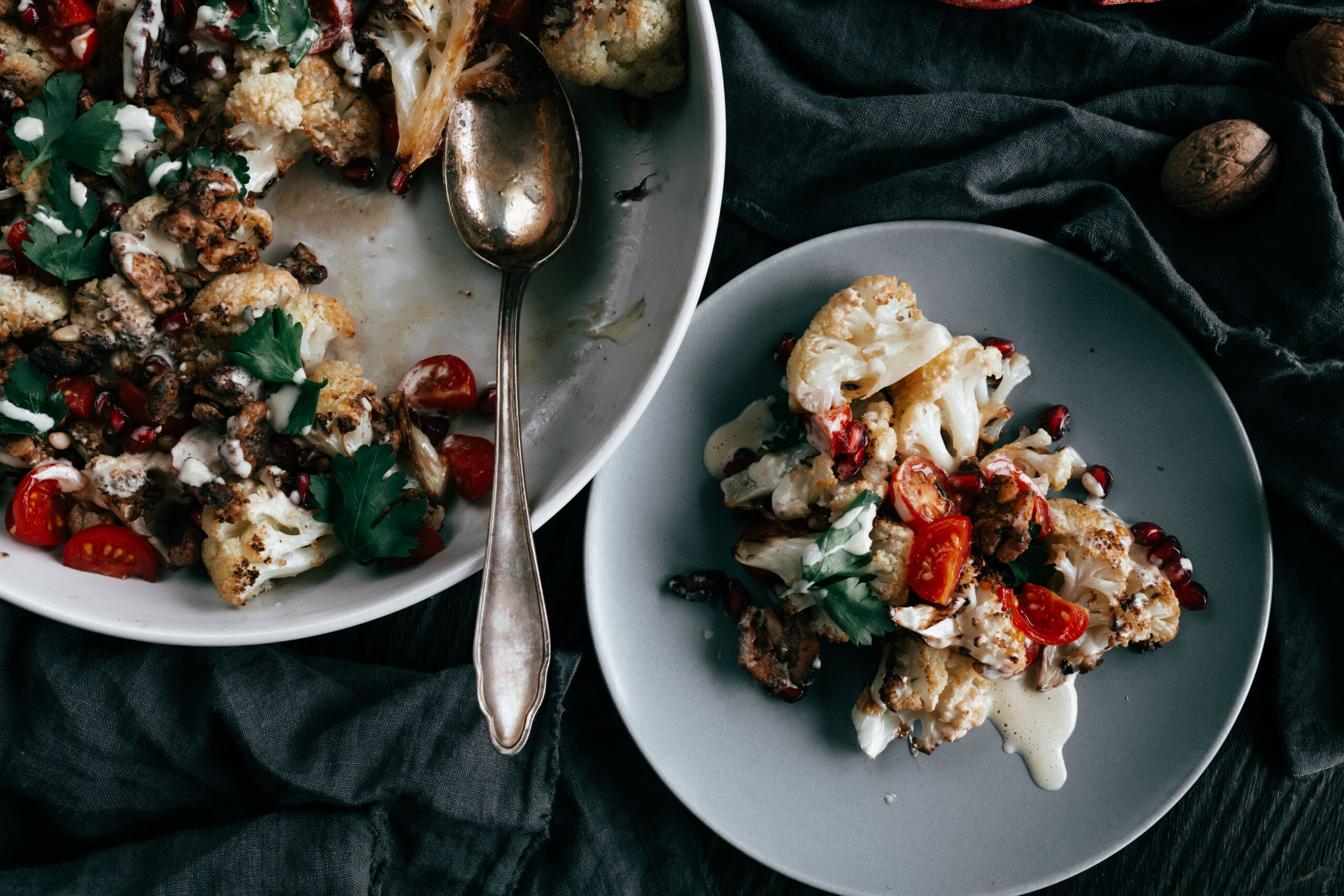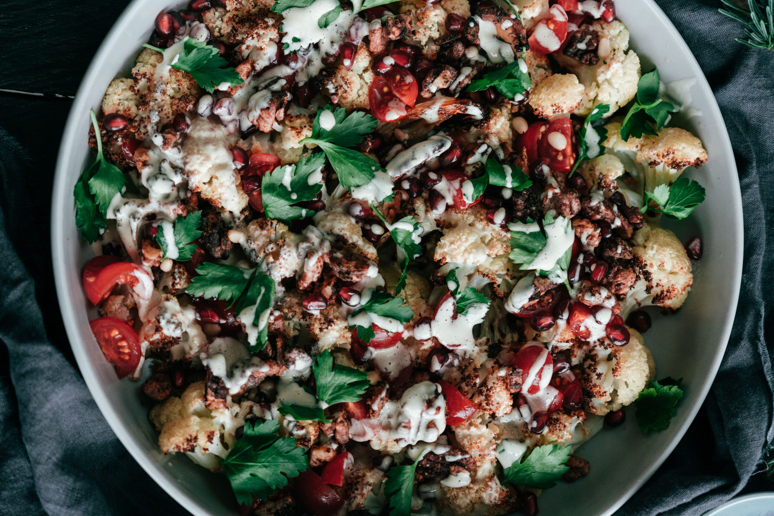 Voilà: Blumenkohl, Tomaten, Granatapfel, Kräuter, Nüsse und ein leckeres Tahini-Zitronen-Dressing