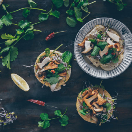 Zum Anrichten erst etwas Microgreens auf die Fajita geben, dann die Pilzmischung, zum Schluss noch Koriander, Chili und noch ein Spritzer Limettensaft. Falten und von Hand geniessen.
