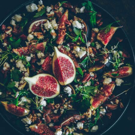 Dieser Feigensalat an Honigdressing überrascht durch die Vielfalt an Geschmäckern: süss, auf verschiedene Arten salzig, erdig, nussig. Der Salat passt als Vorspeise oder auch als leichtes Znacht.