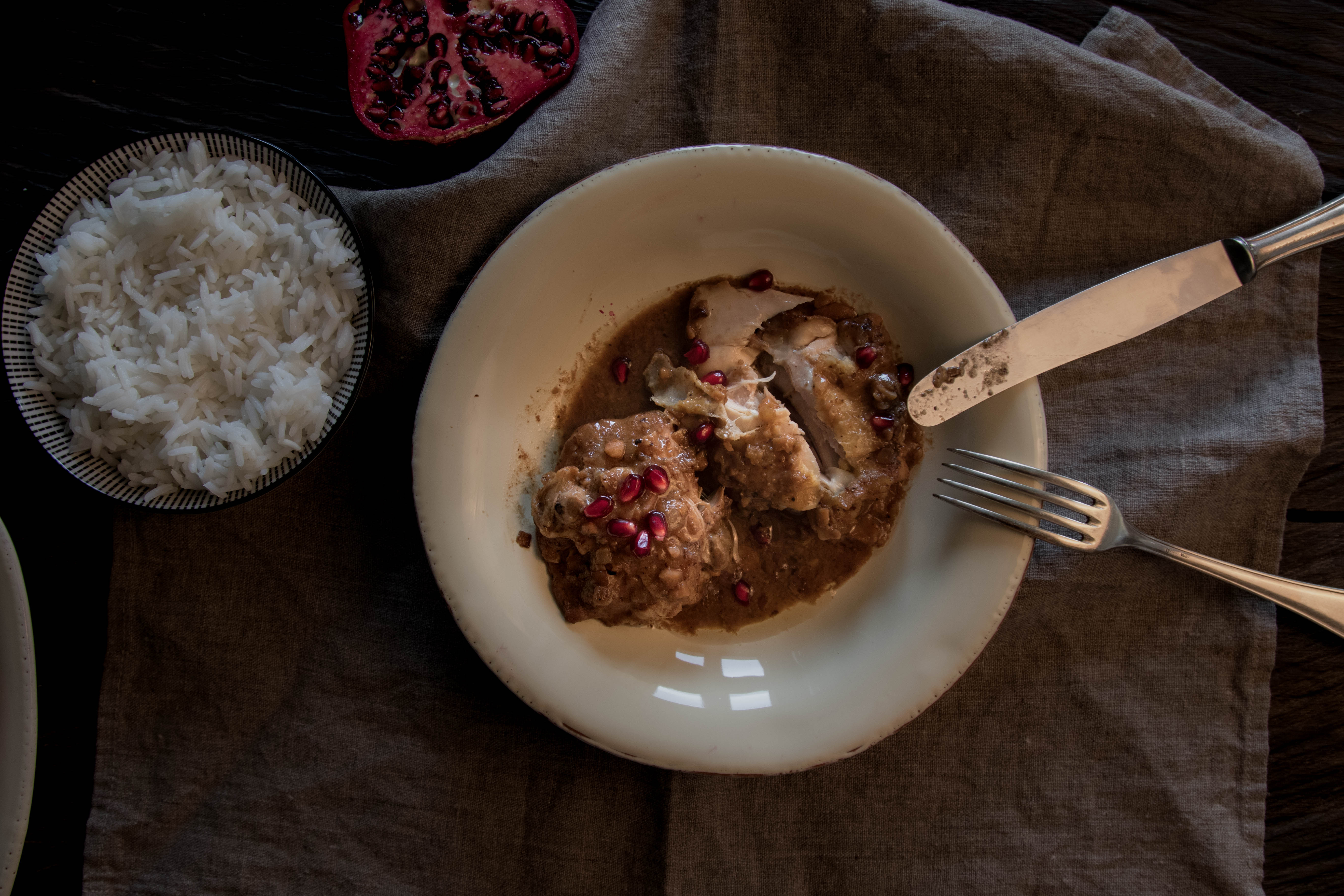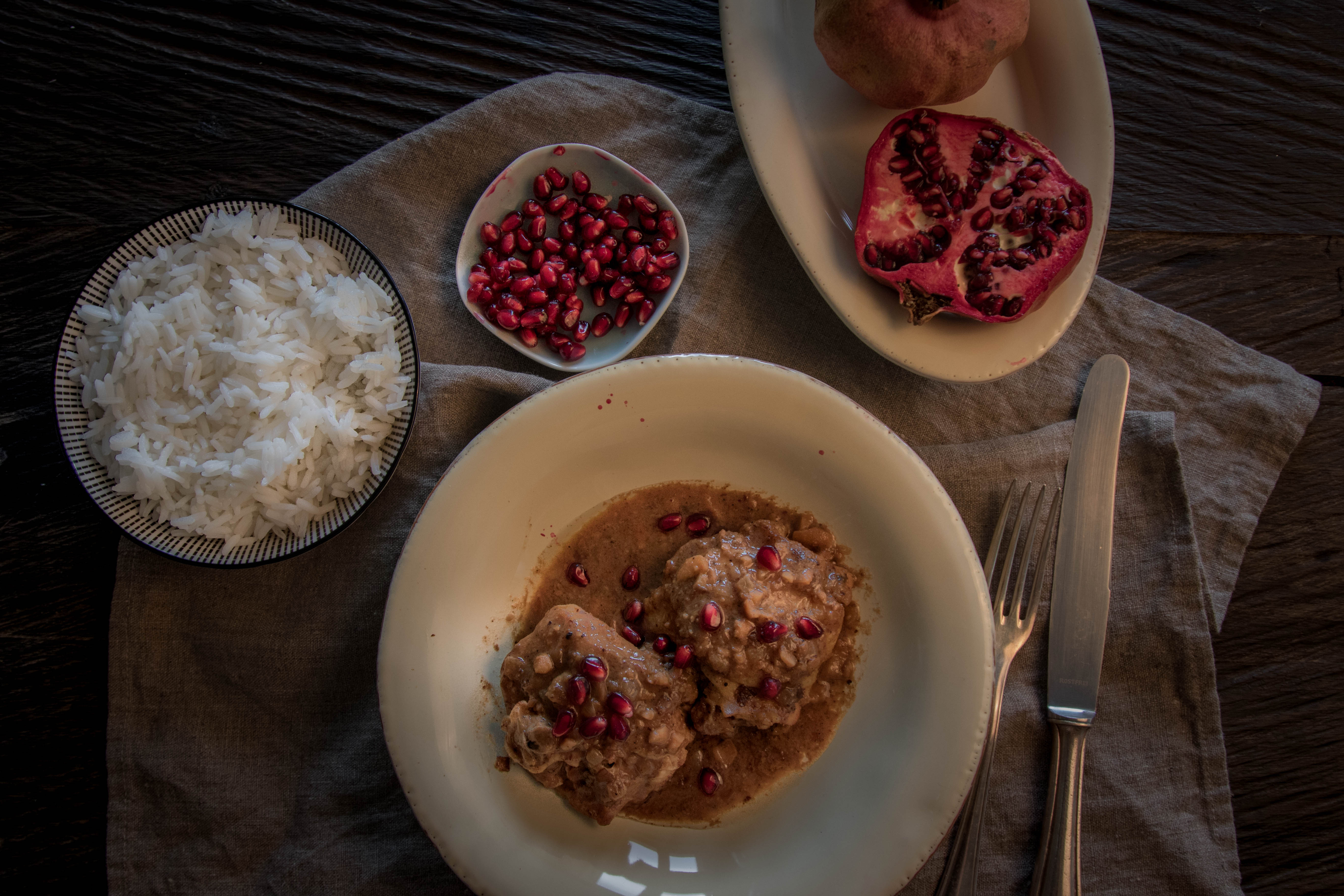 Inspiriert von der Persischen Küche, hab ich dieses Schmorgericht ausprobiert. Im Originalrezept wird die Sauce mit Walnüssen gekocht, ich hab die Vor-Samichlaus Erdnüsse verwertet. Und es war sehr lecker. Also sehr. Diese Kombination von Nüssen mit der säuerlich-fruchtigen Granatapfelmelasse..hmmm. Ich mag ja Schmorgerichte und Eintöpfe sowieso. Die kann man nämlich prima vorbereiten und sie schmecken beim 4. Mal Aufwärmen noch ein bisschen besser als am Vortag.