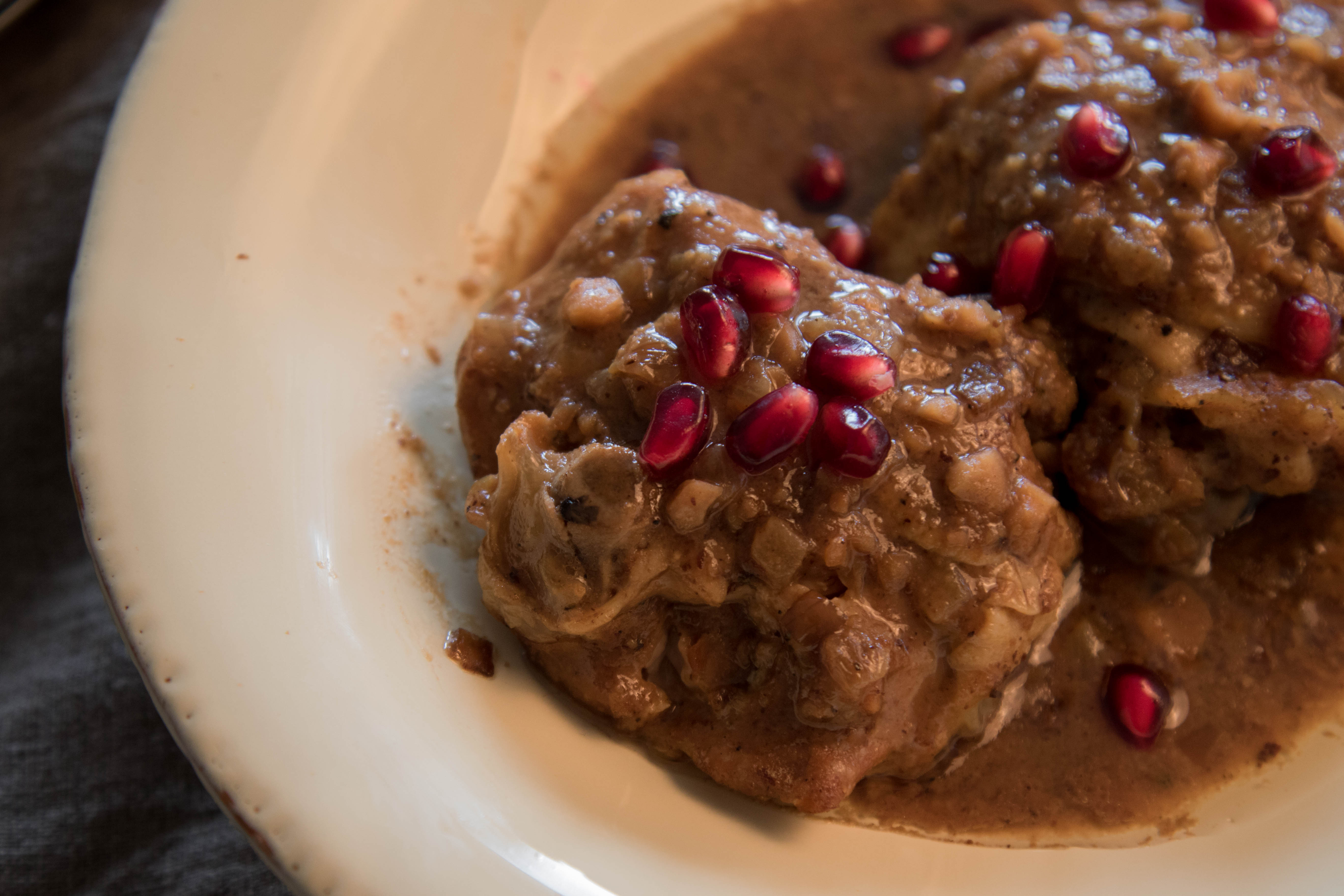 In einer zweiten hohen Bratpfanne das Mehl rösten und dann die Nüsse dazu geben und auch rösten. Achtung: nicht zu heiss, die Nüsse werden sonst rasch schwarz. 0.5 Liter kaltes Wasser dazu giessen und aufkochen. Zudecken und bei geringer Hitze köcheln lassen. Nach ca. 45 Minuten setzt sich das Nussöl an der Oberfläche ab. Erst dann Zucker und Granatapfelsirup hinzugeben und gut verrühren. Pouletstücke in die Sauce geben und noch einmal 1-2 Std. köcheln lassen. Mit Granatapfelkernen garnieren und mit Reis servieren. Unbedingt Resten übrig lassen, damit man das Gericht noch mal aufwärmen kann. Und nochmal. Es schmeckt im Fall jedes Mal noch besser.