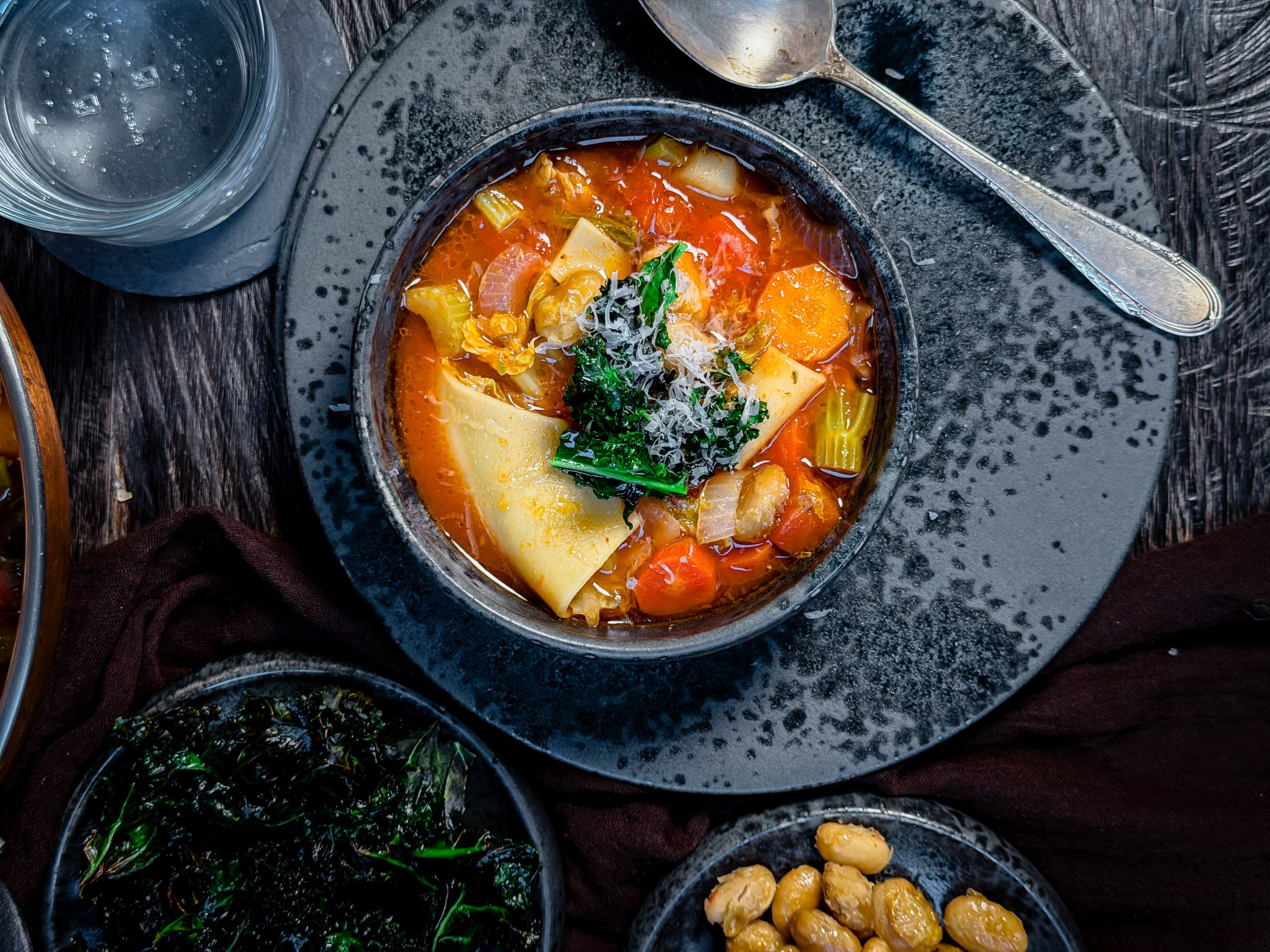 Diese Minestrone ist ein Abschied: kräftig, ehrlich, unkompliziert. Mit kleinen Extras, die alles besser machen: knusprige weisse Bohnen und knuspriger Federkohl für den Crunch. Und ein Stück Parmesanrinde, die ich mitkoche.