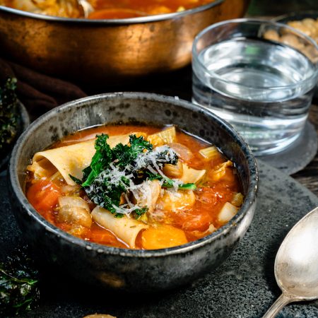 Minestrone mit knusprigen weissen Bohnen und Federkohl