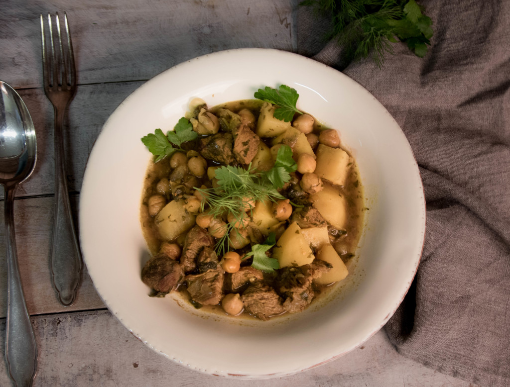 Eintopf: Rindfleisch, Kartoffeln, Kichererbsen, Kräuter und Granatapfelmelasse