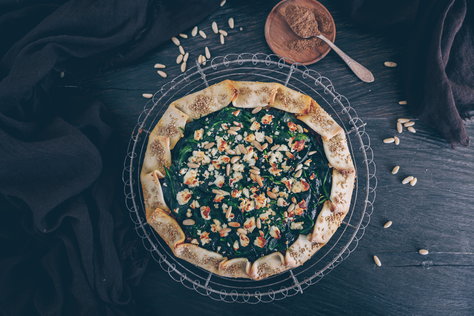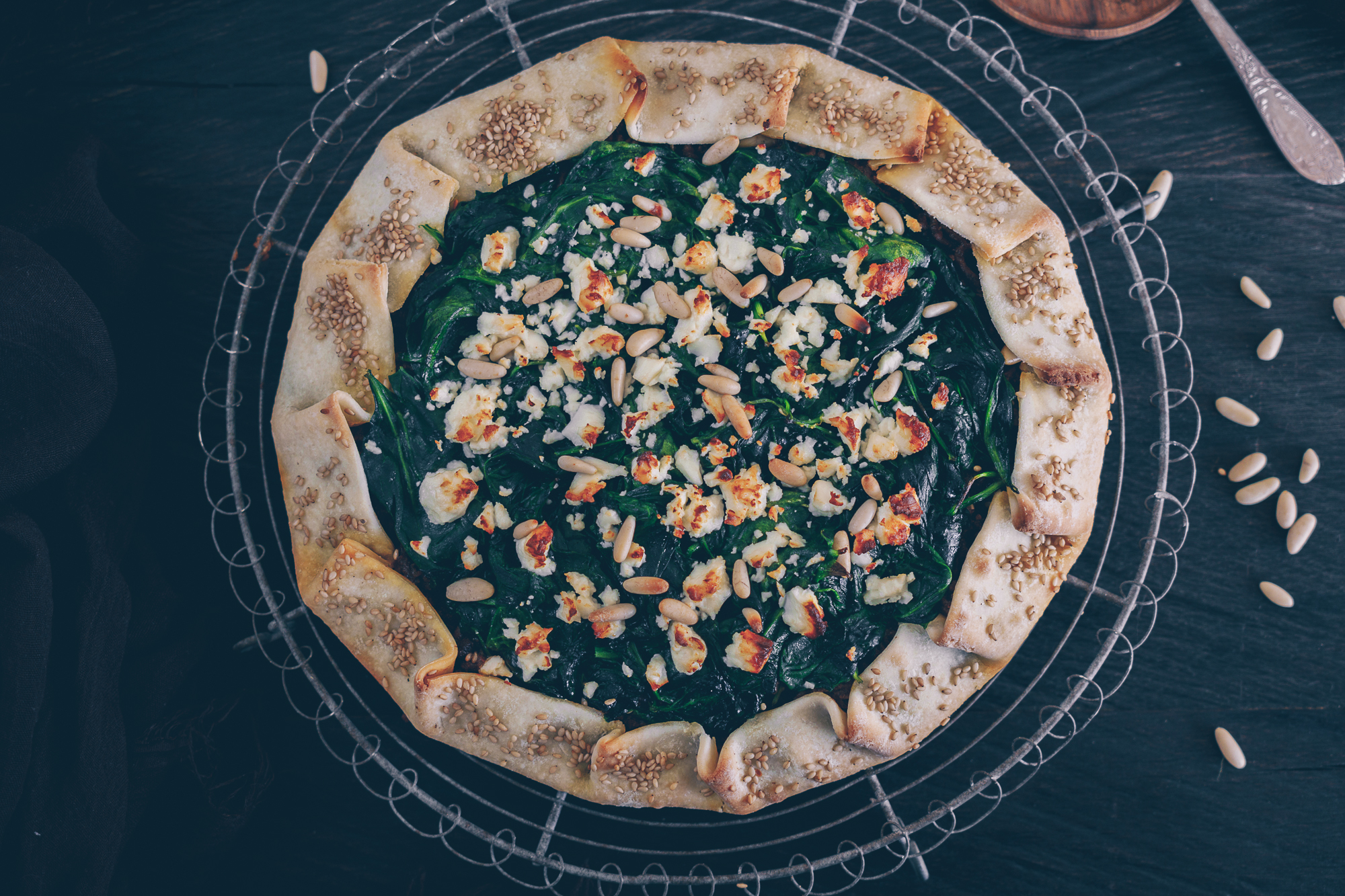 - Zuletzt den Feta mit der Hand über den Spinat zerbröseln und die restlichen Pinienkerne darüber streuen.