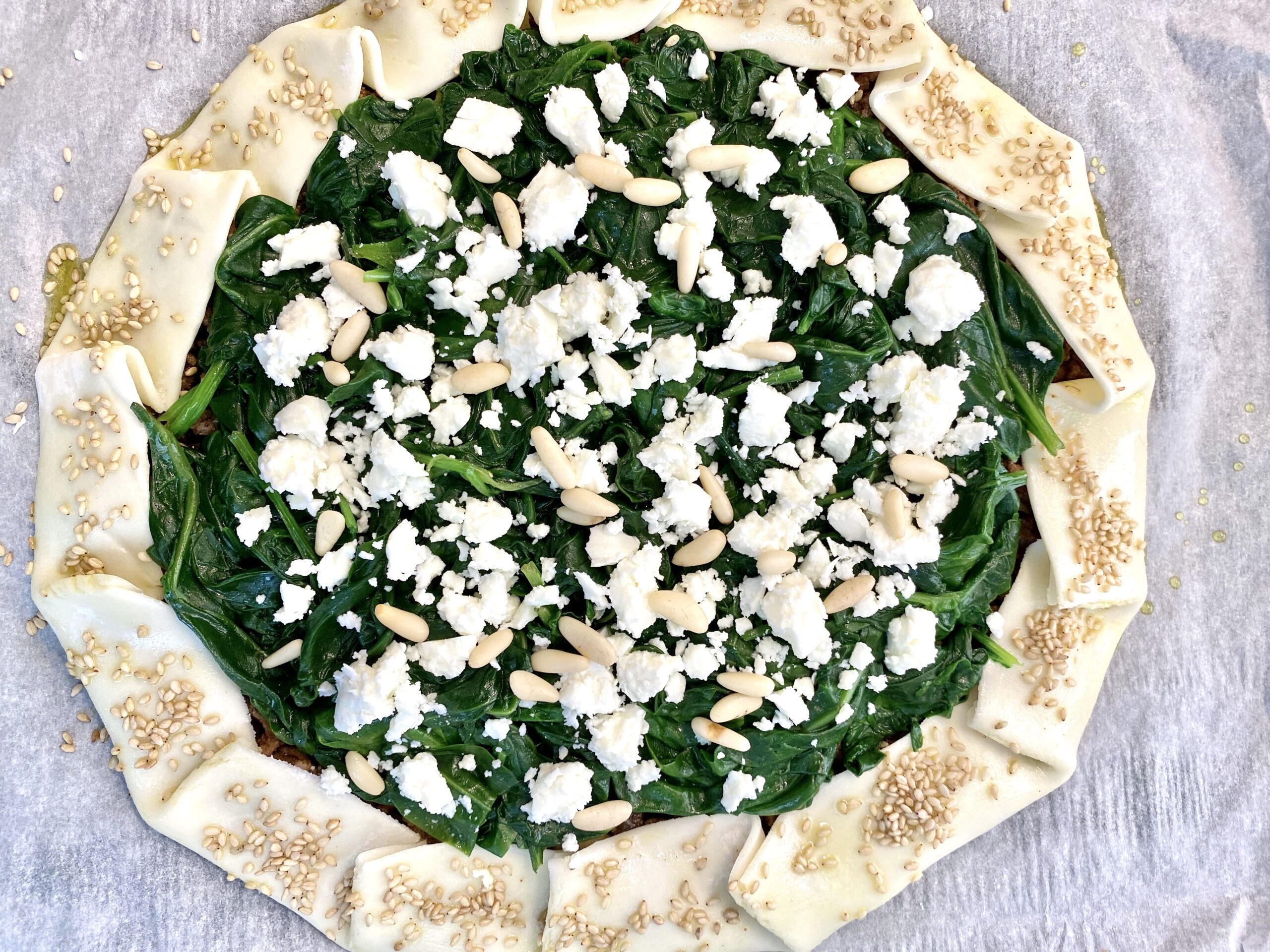 orientalischer Fleischkuchen mit Spinat und Feta: ich habe den Rand mit Olivenöl bepinselt und mit Sesam bestreut.