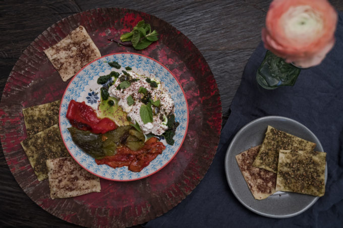 Rauchige, geröstete und eingelegte Peperoni mit Labne und Kräuterpesto