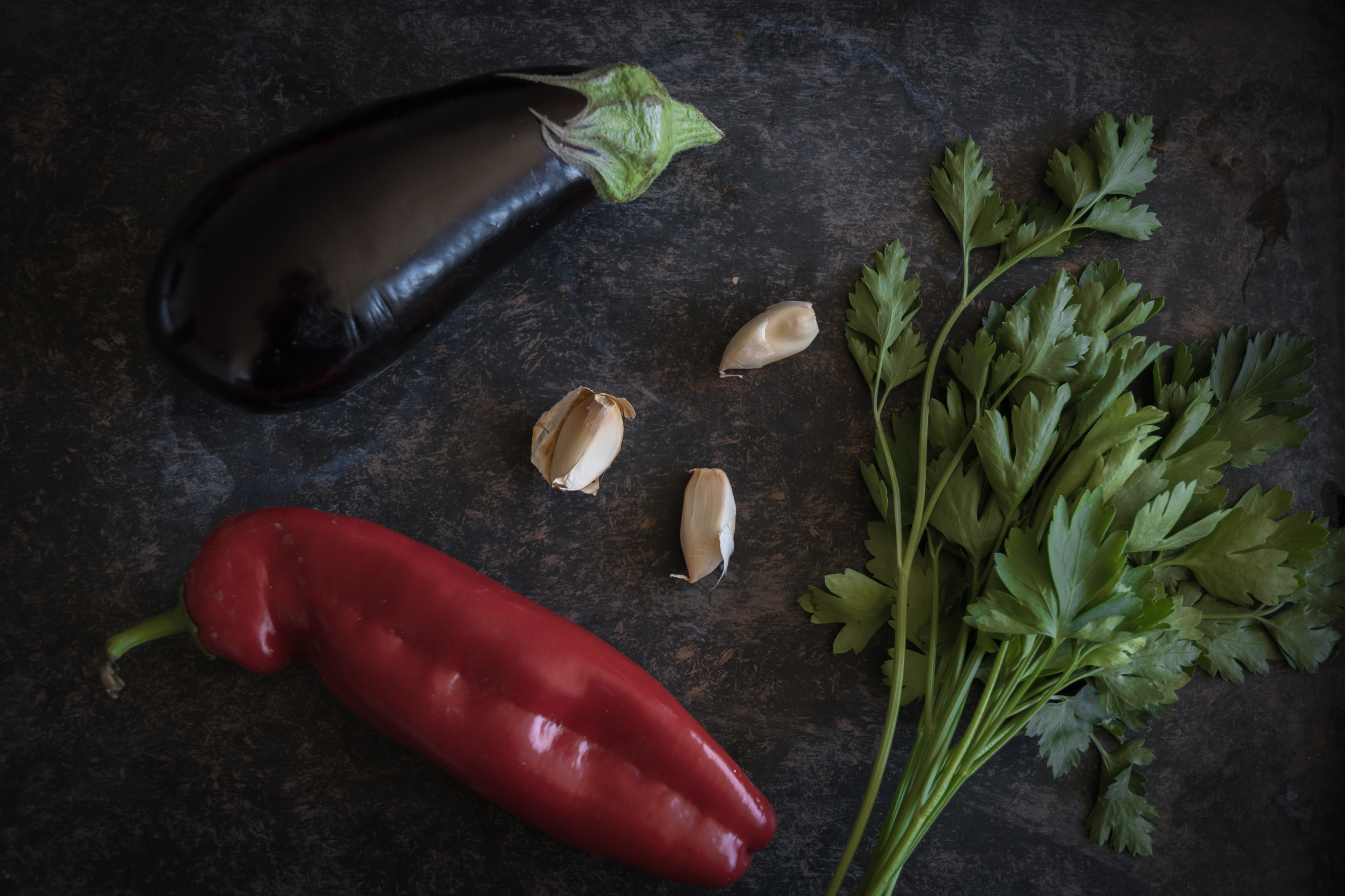 Aubergine, Peperoni, Knoblauch und Petersilie