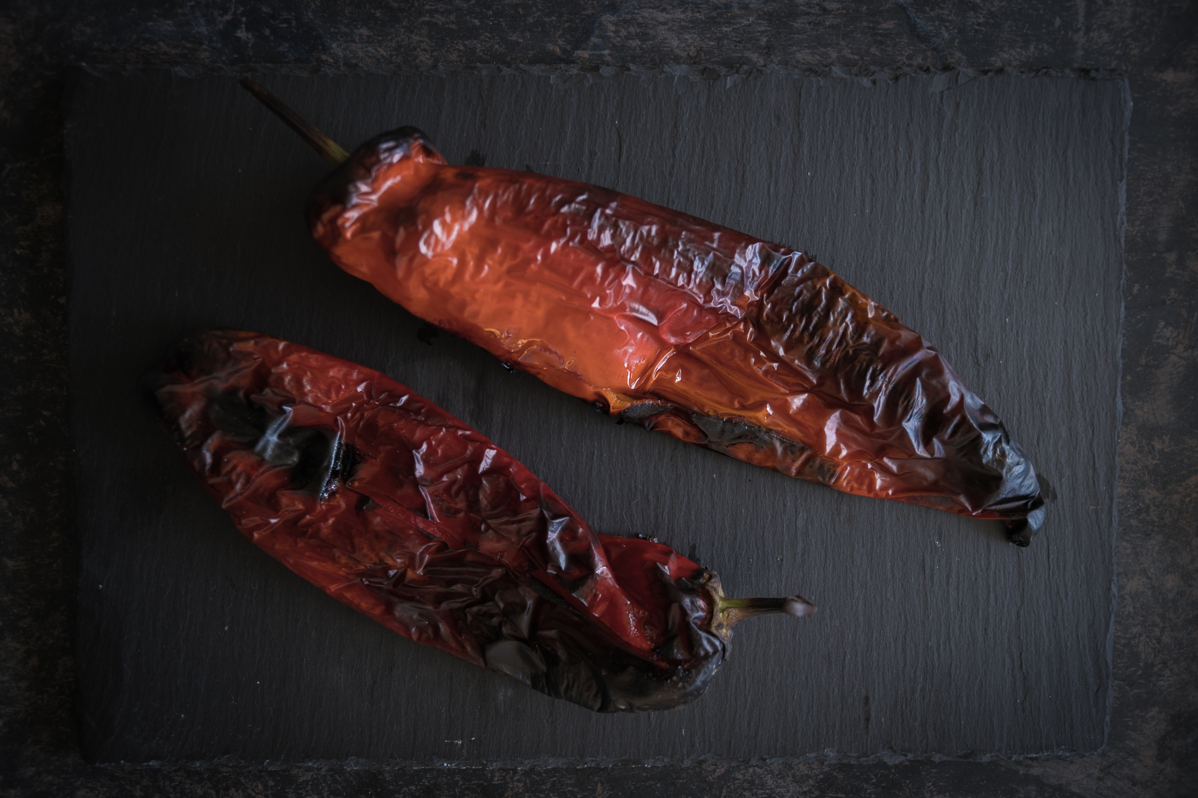 - Nach 20 Minuten die Peperoni aus dem Ofen nehmen. Etwas abkühlen lassen und dann Stiel, Schale und Kerne entfernen.