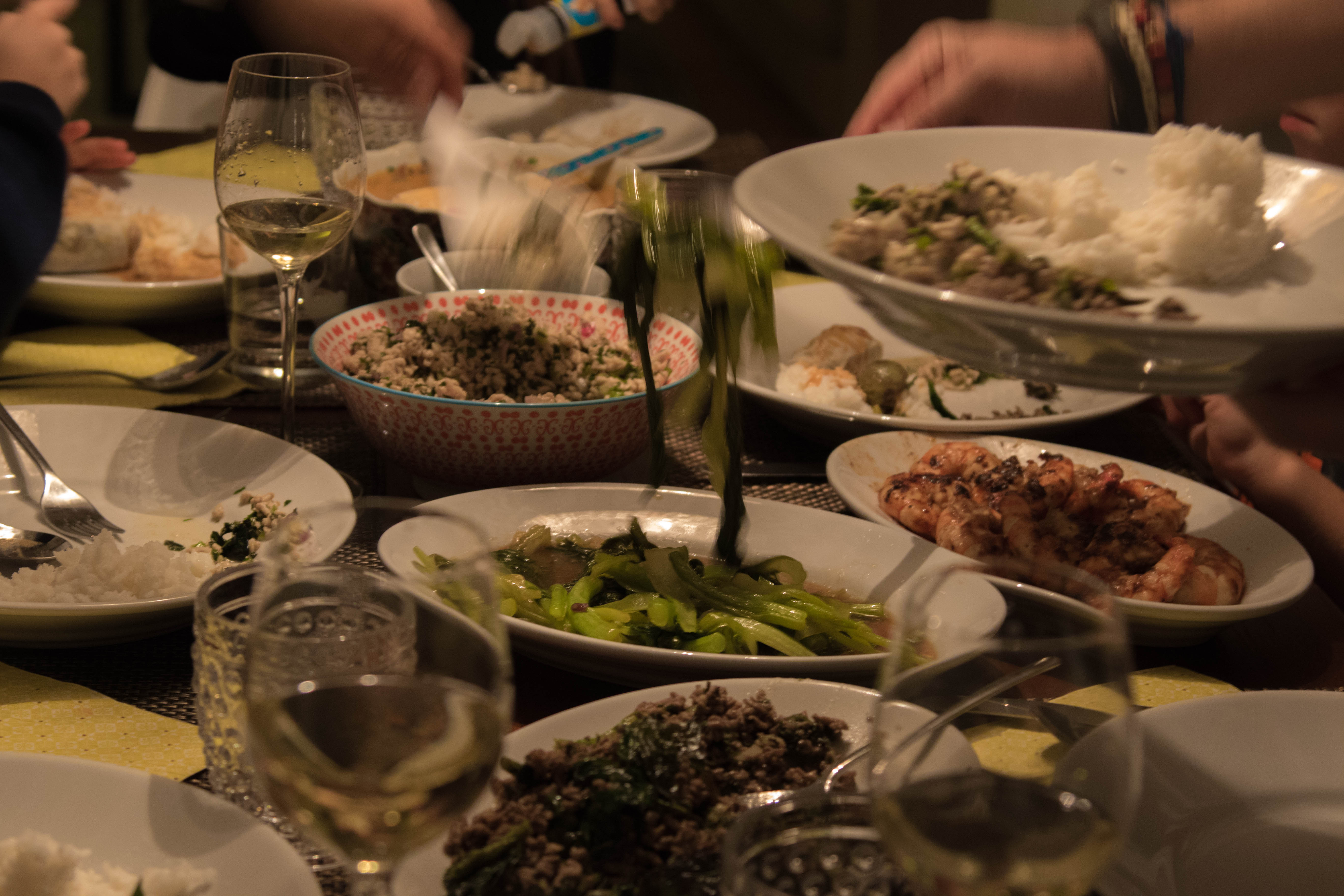 Am liebsten koche ich Thai für eine grosse Runde. Nur dann kann ich aus dem Vollen schöpfen, denn Thaifood macht nur Spass, wenn man aus ganz vielen Töpfen probieren kann. Von allem ein bizli und das immer wieder. Meine Lieblingsgäste sind da alle selber Meinung. Auch wenn ich beim Zubereiten nur ganz kurz den Gedanken habe, vielleicht können wir morgen noch ….nein. Resten gibt’s eigentlich nie. Was ja auch ein gutes Zeichen ist, oder?