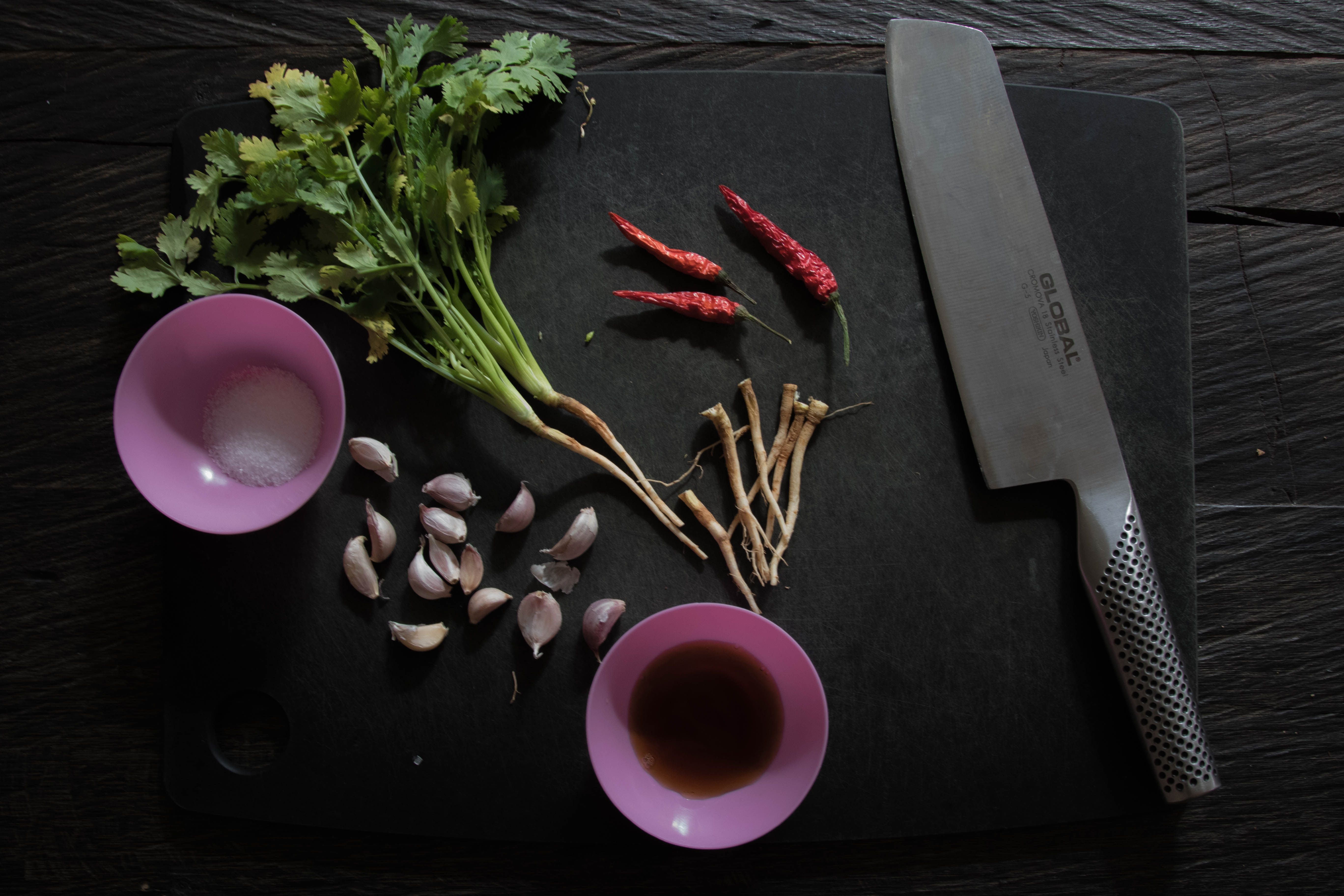 - Korianderwurzel, gehackt (einen Bund Koriander mit Wurzel bekommt man im Thai-Laden)