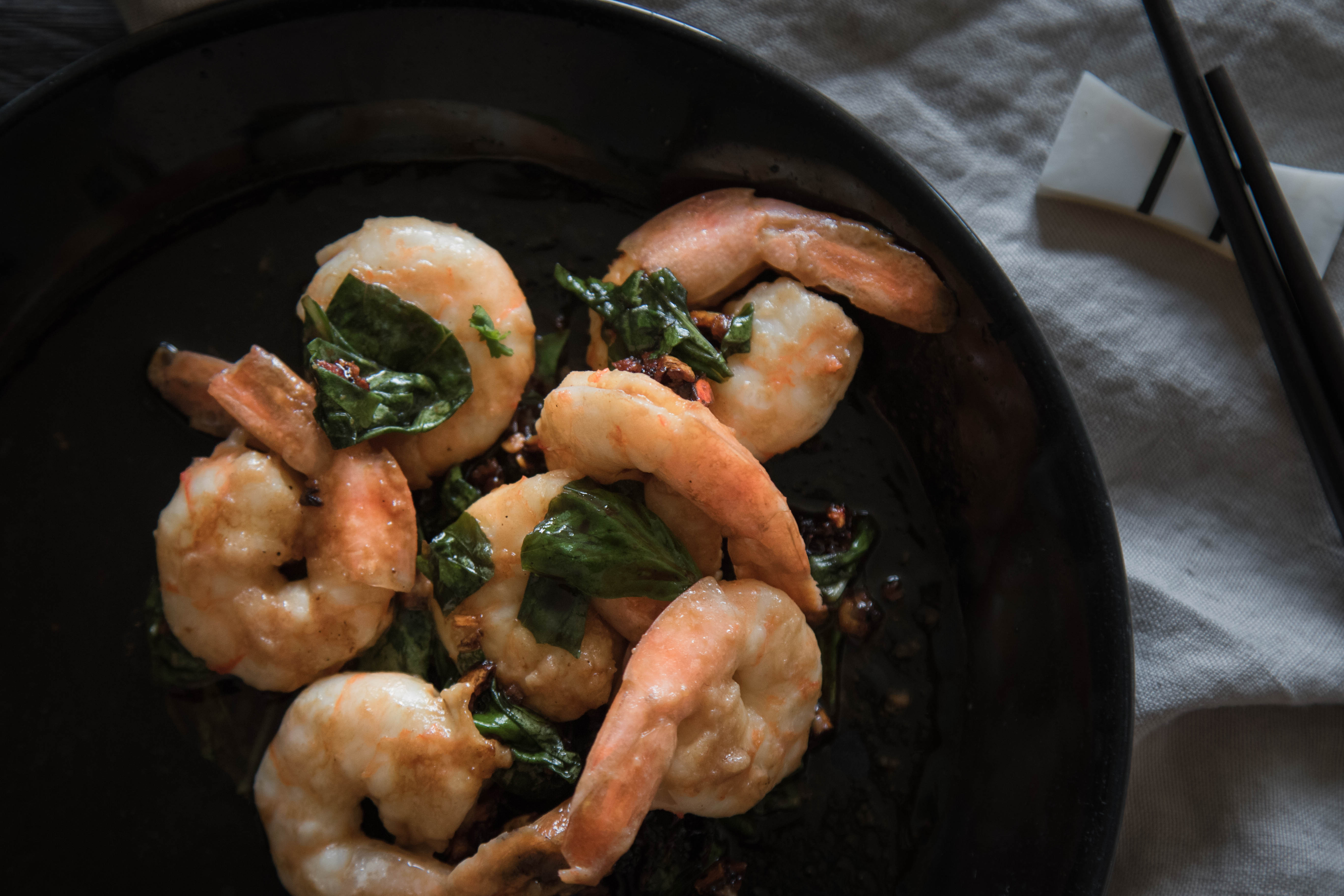 Riesencrevetten aus der Schale lösen, putzen, Darm entfernen. Die Crevetten in eine Schüssel geben und mit etwas Sojasauce und Tamarindenpaste marinieren. Für die Sauce Knoblauch und Korianderwurzel im Mörser zerstossen. Chilis klein schneiden, Basilikumblätter abzupfen und in Wasser legen. Die Koriander-Knoblauch-Mischung und den Chili in wenig Öl anbraten, mit Fischsauce, heller Sojasauce und etwas Zucker abschmecken. In eine Schüssel geben und die Basilikumblätter darunter mischen. Crevetten mit etwas Mehl bestäuben und in etwas Öl anbraten. Sauce dazu geben und Reis dazu servieren.