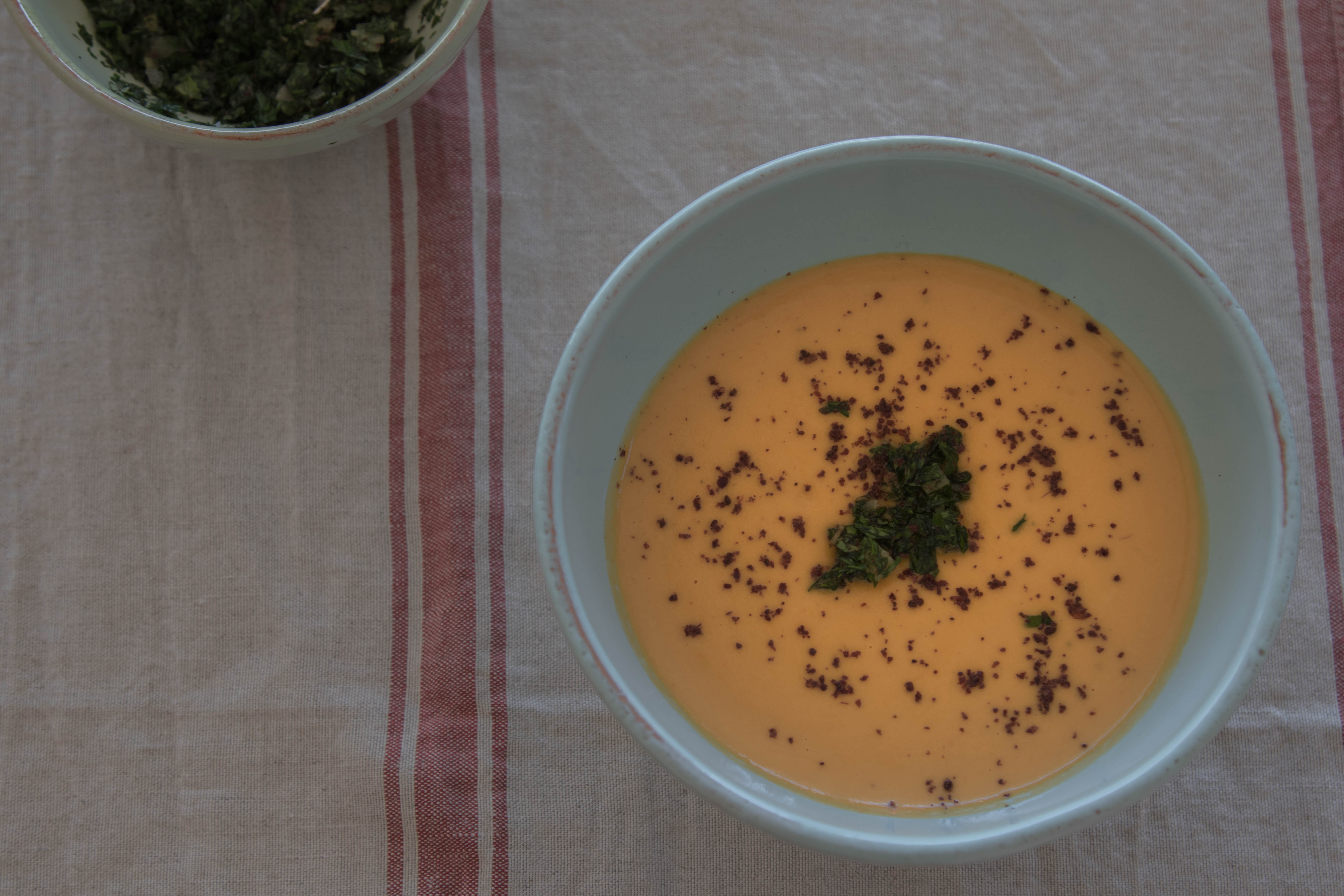 Für das Zitronenpesto Pfefferminze, Petersilie, Koriander fein hacken. 1/4 Salzzitronenschale hacken und daruntermischen, mit ein wenig Sumach würzen. Mit ein paar Tropfen Olivenöl mischen. Die Suppe damit garnieren.