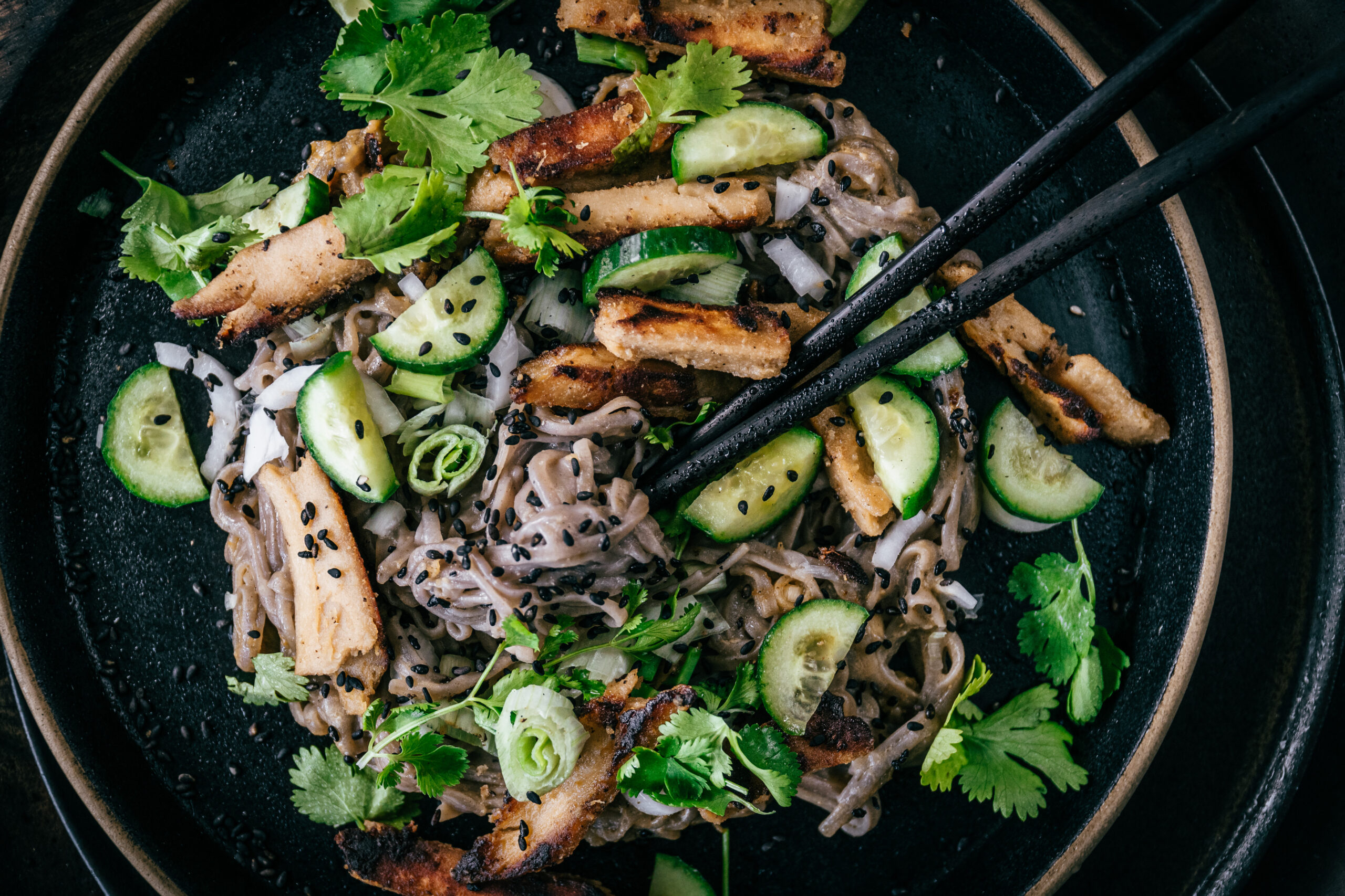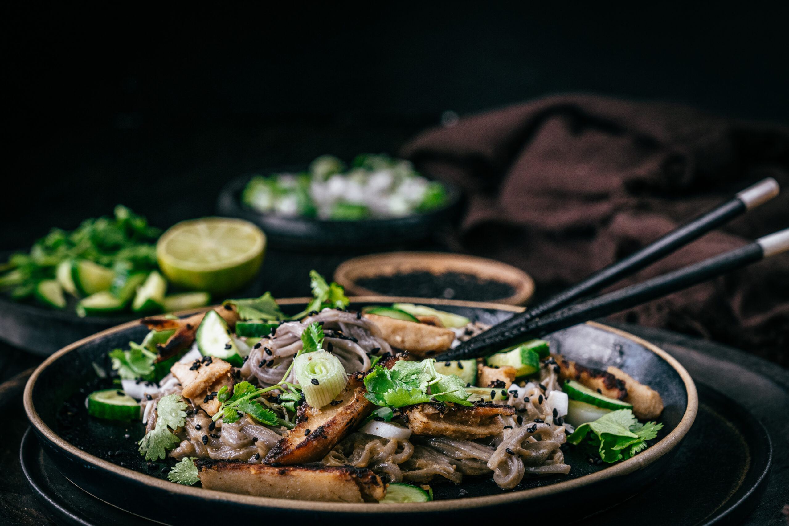 Ich serviere sie an einer cremigen Sauce aus veganer Butter, Misopaste und Tahini. Dazu kombiniere ich knusprig gebratene 🌱-Poulet Stücke (z.B. V-Love oder Planted), Frühlingszwiebeln und Gurken.