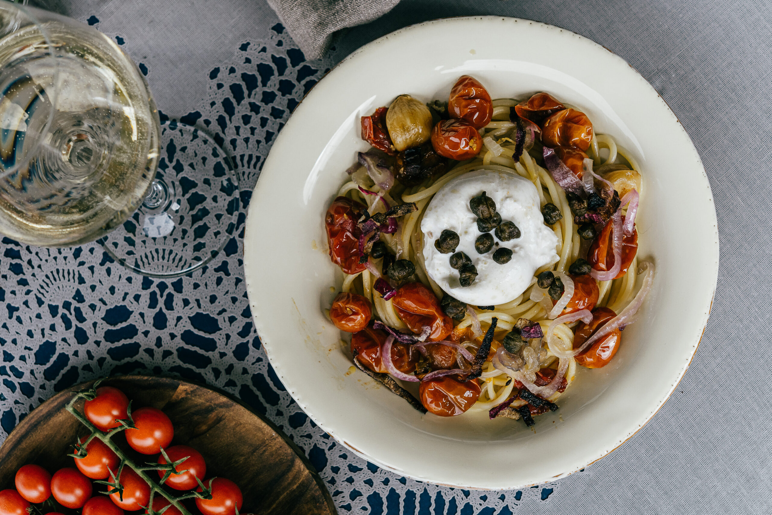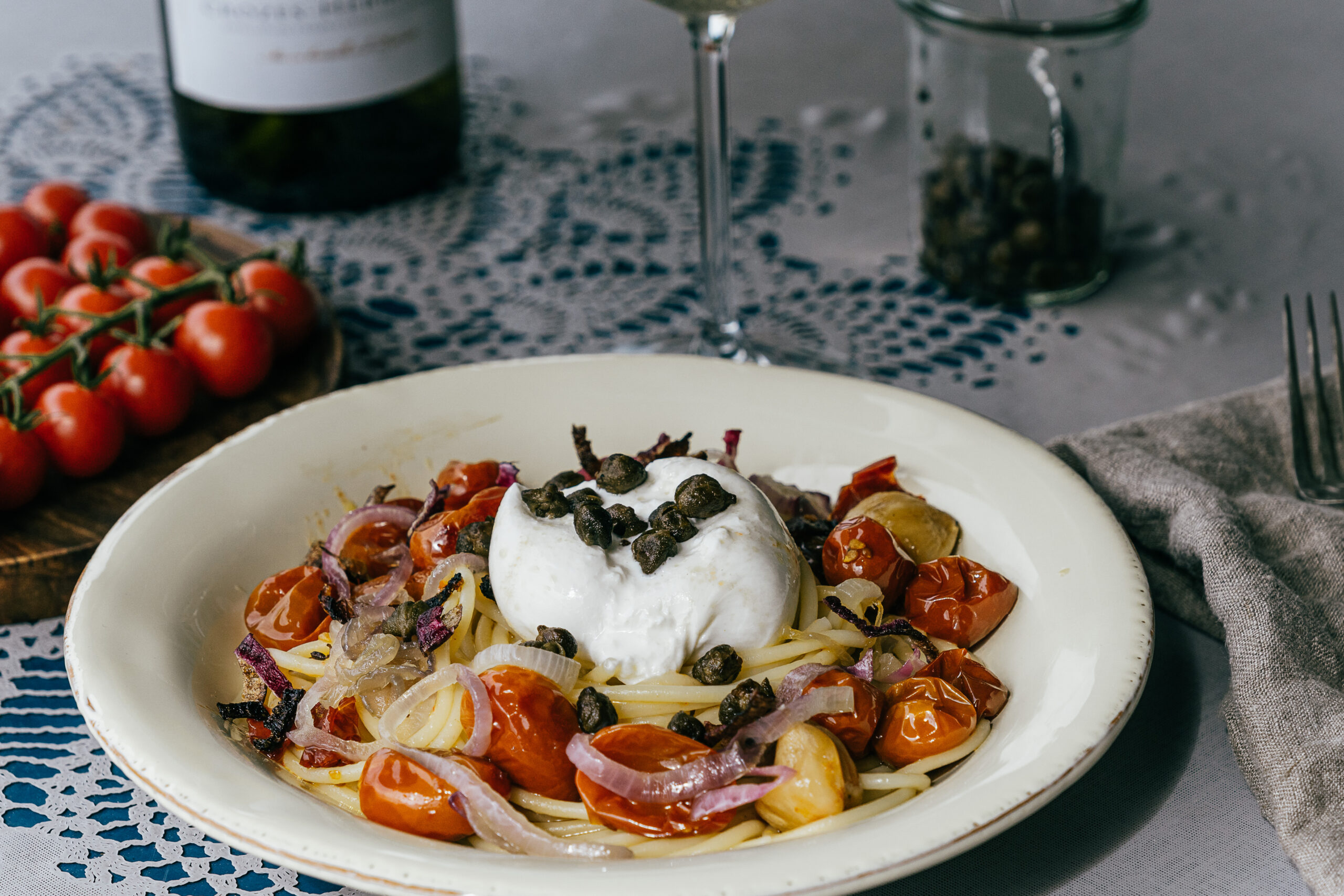- Die Spaghetti mit den geschmorten Tomaten anrichten. Mit Kapern und Zwiebel toppen und mit Burrata garnieren. Das Öl, in welchem die Tomaten geschmort haben ist Gold wert, also ohne weiteres noch mehr davon zum Schluss über die Pasta träufeln.