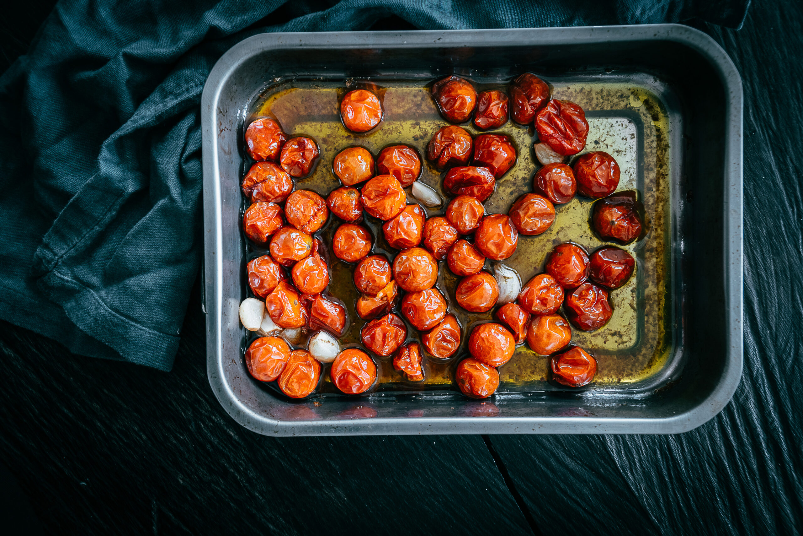 Tomaten, Knoblauch, Olivenöl und Salz. Mehr braucht es nicht. Wichtig bei diesem Rezept ist das langsame Schmoren, wir wollen für einmal keine Röstaromen sondern den intensiven, karamellisierten Geschmack der Tomaten. Wer mag, kann natürlich noch Kräuter dazugeben, ich finde es bei diesem Gericht aber nicht nötig. Wenn die Tomaten aus dem Ofen kommen, kannst du sie mit einer Gabel etwas zerdrücken und das Tomatenmark mit dem Olivenöl vermischen…hmmm! Liquid Gold. Unbedingt aufheben und ebenfalls über die Pasta geben.