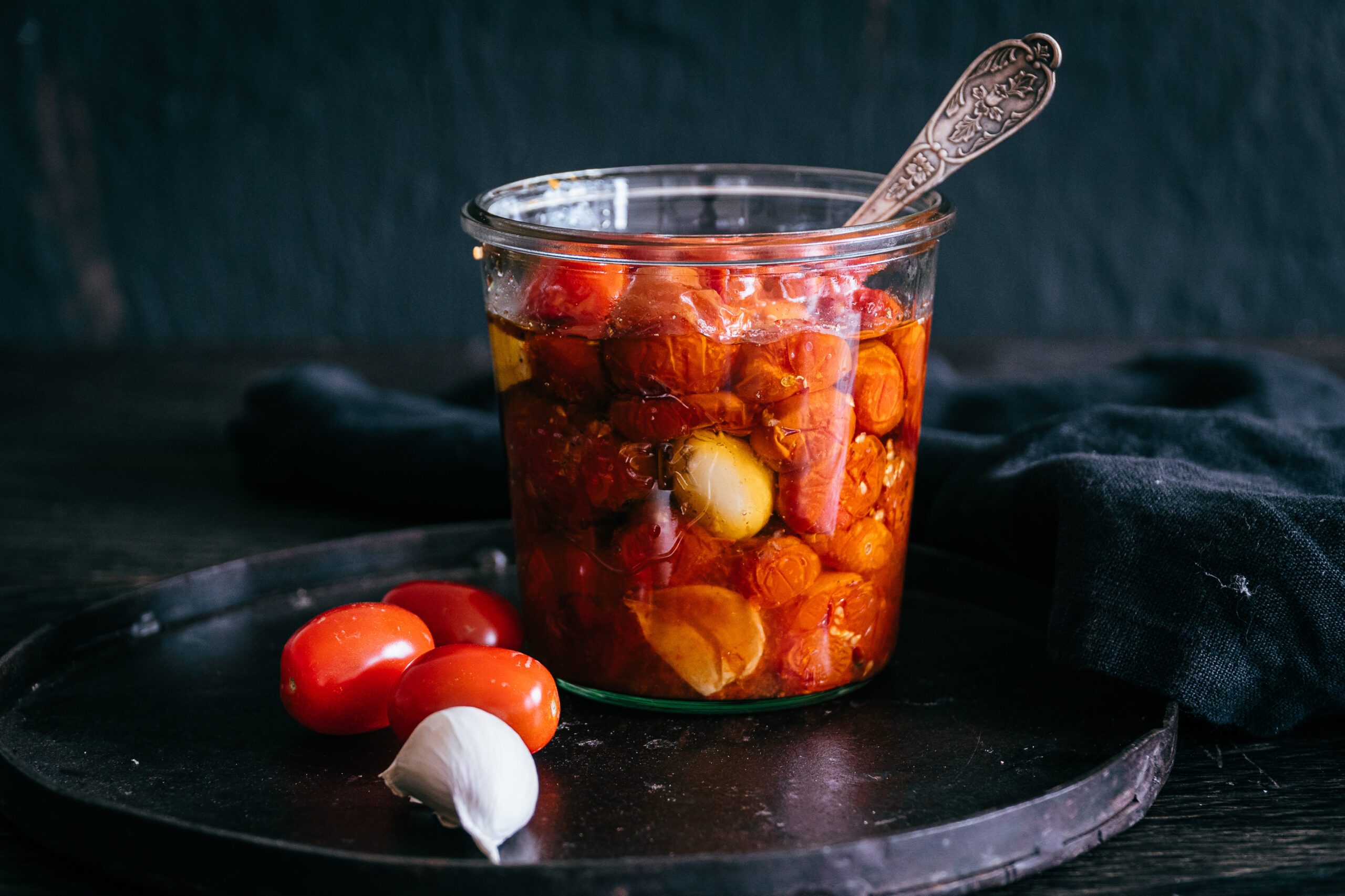 - Die Tomaten waschen und mit Olivenöl, Salz, Pfeffer und den geschälten Knoblauchzehen in eine Auflaufform geben und für 2 Stunden bei 150 Grad schmoren.