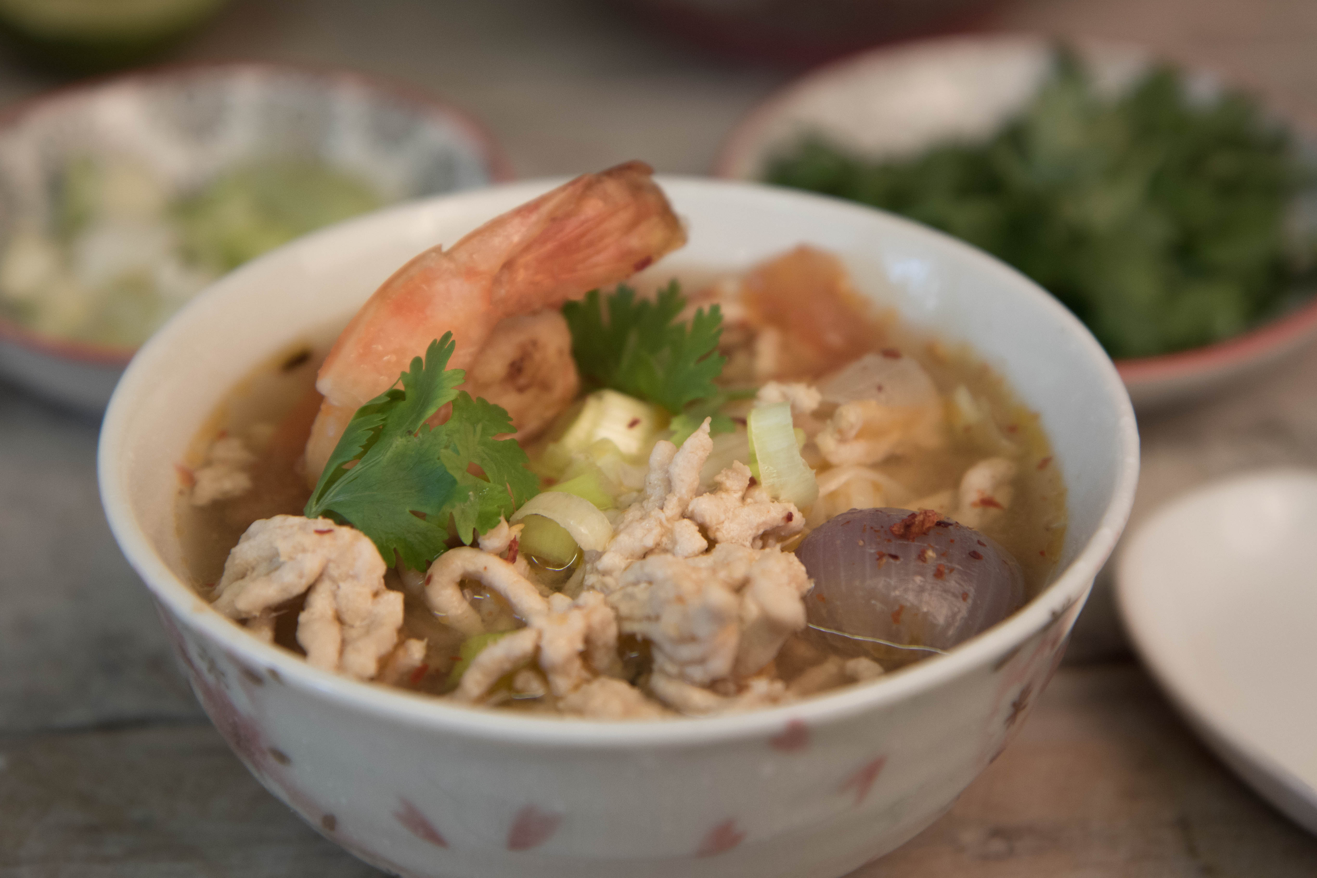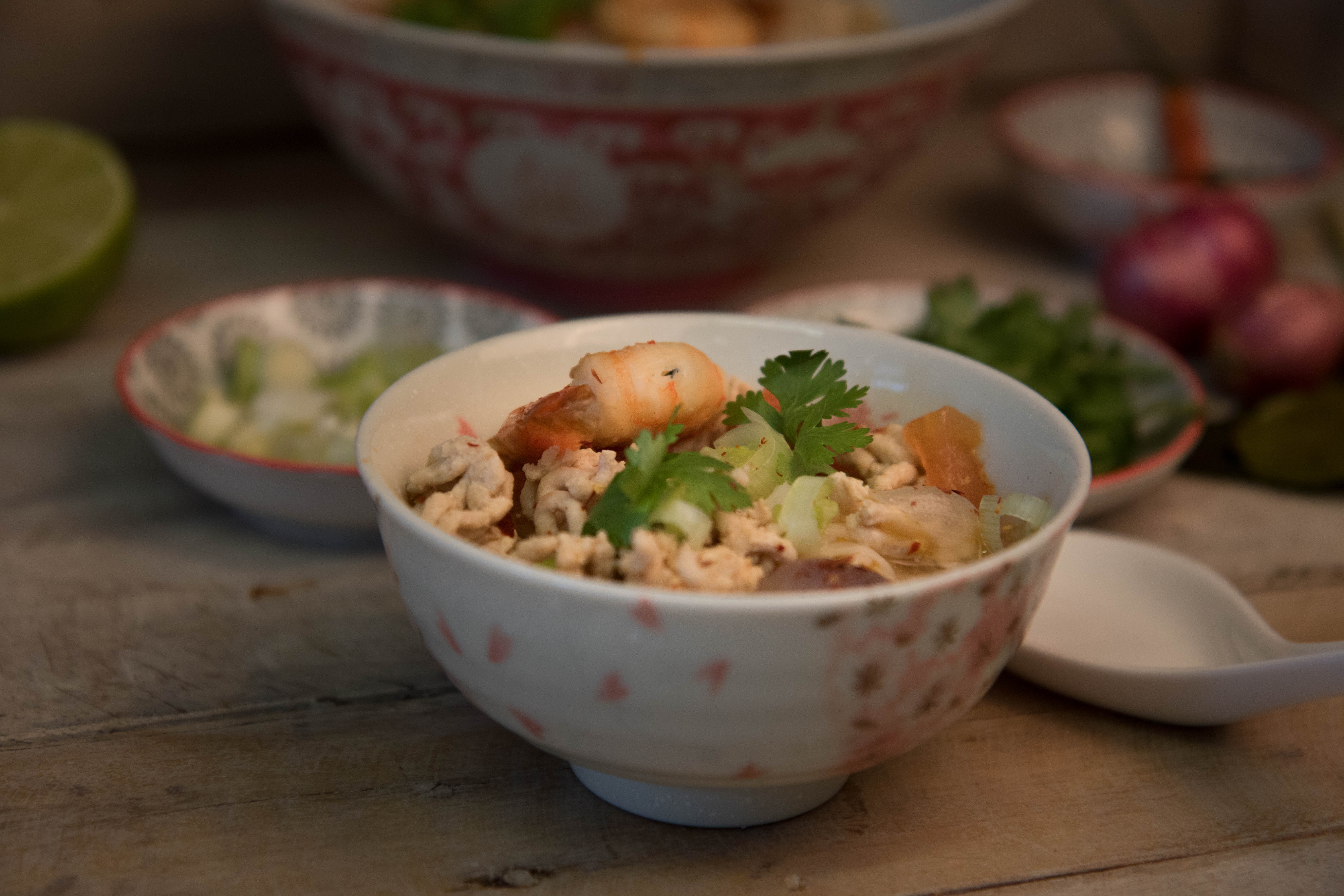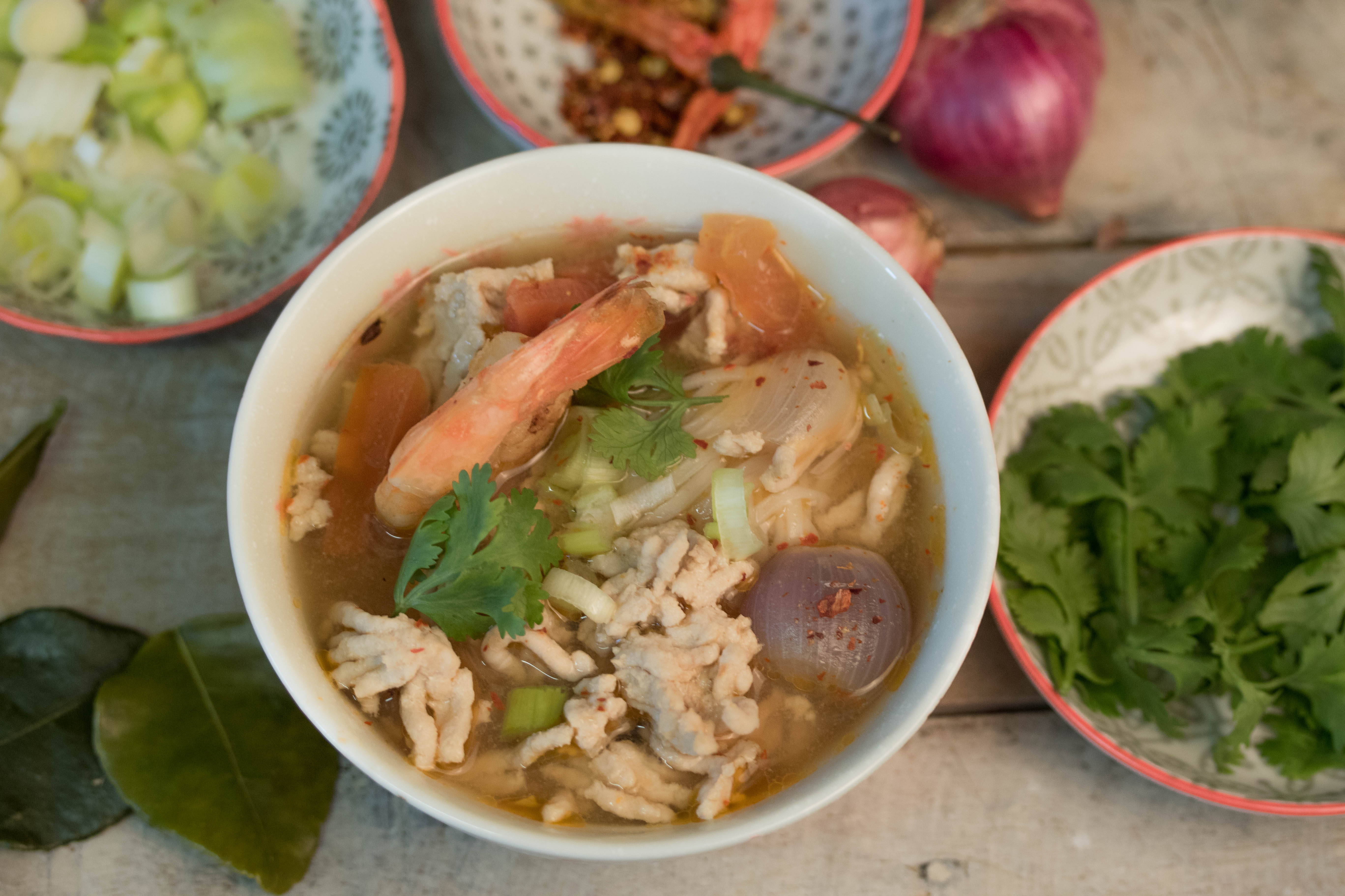 Tom Yam ist eine meiner Lieblingssuppen. Scharf und sauer und frisch. Die klassische Tom Yam Suppe kommt mit Gung, also mit Riesencrevetten. In meiner Variante kommen gehacktes Poulet, Nudeln und Riesencrevetten in die Suppe.