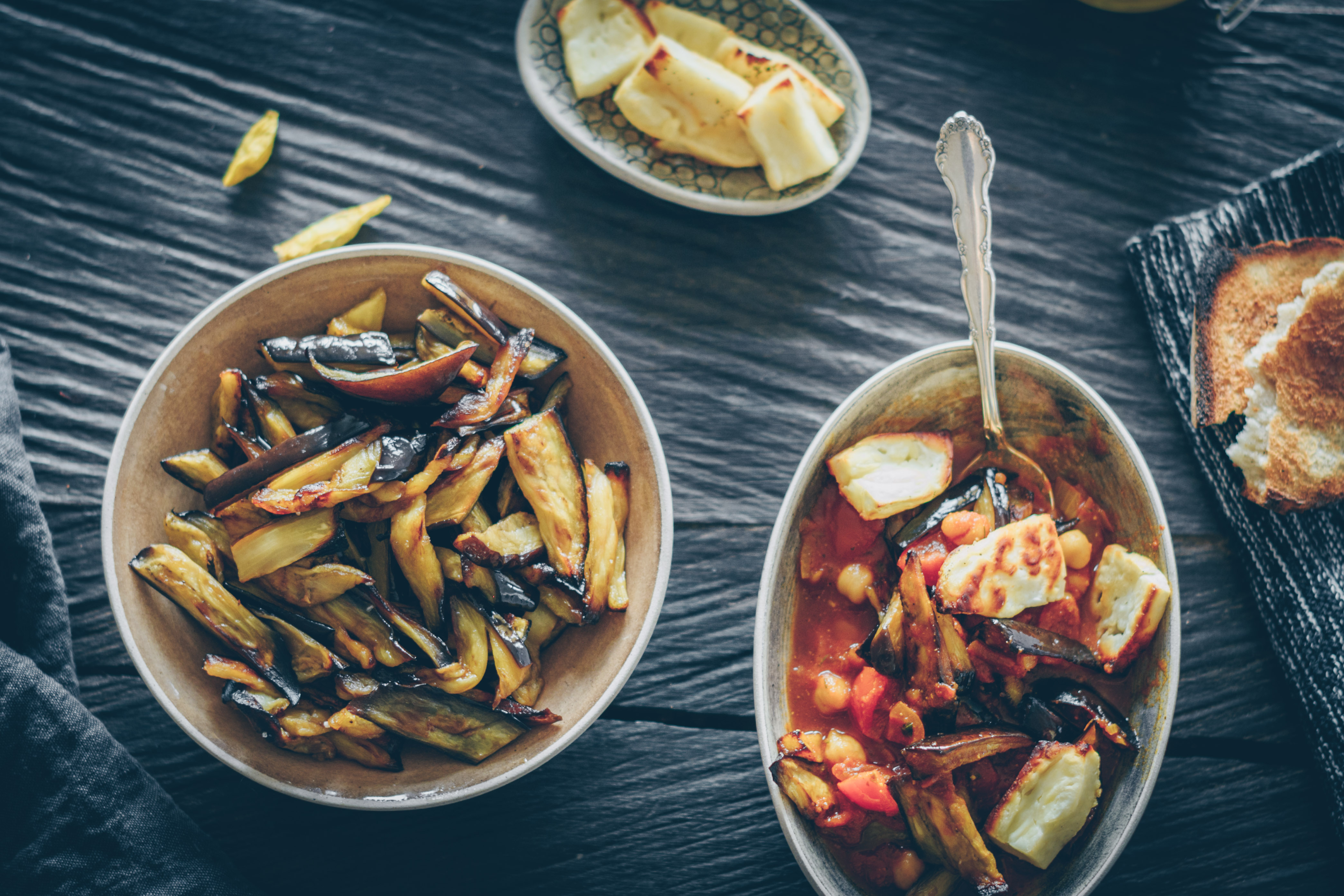 Zaalouk: Gebackene Aubergine an Tomatensauce mit Halloumi