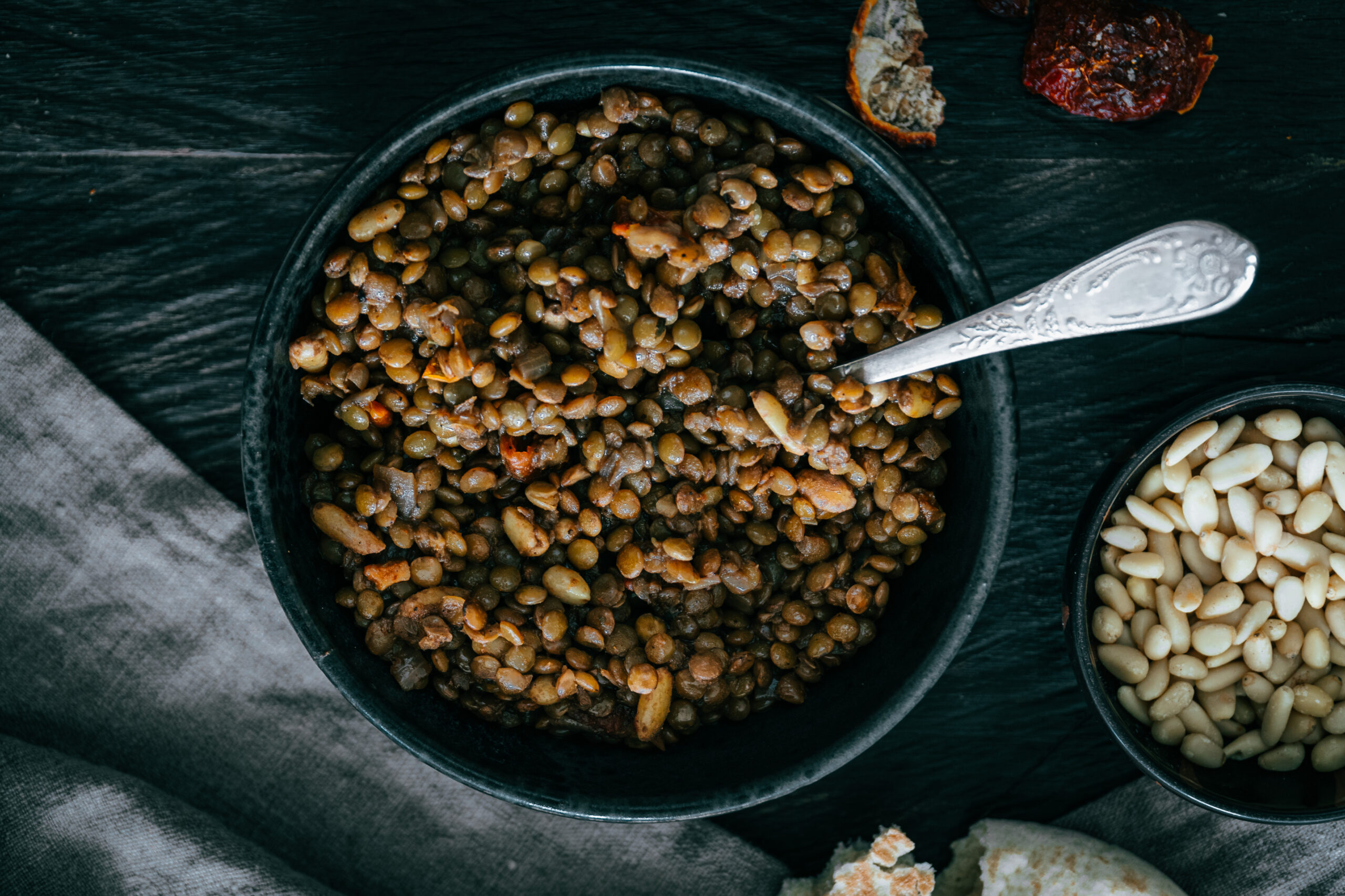 - In einer Pfanne Olivenöl erhitzen, Zwiebeln hinzugeben, 2-3 Minuten unter ständigem Rühren anbraten. Baharat dazu geben. Mit den Zwiebeln vermischen. Pinienkerne dazu geben. Linsen dazu geben. Hitze reduzieren. Tomatenmark hinzugeben. Alles verrühren und mit Bouillon ablöschen. Getrocknete Tomaten hinzugeben. 20 Minuten bei kleiner Hitze köcheln lassen.