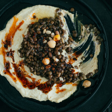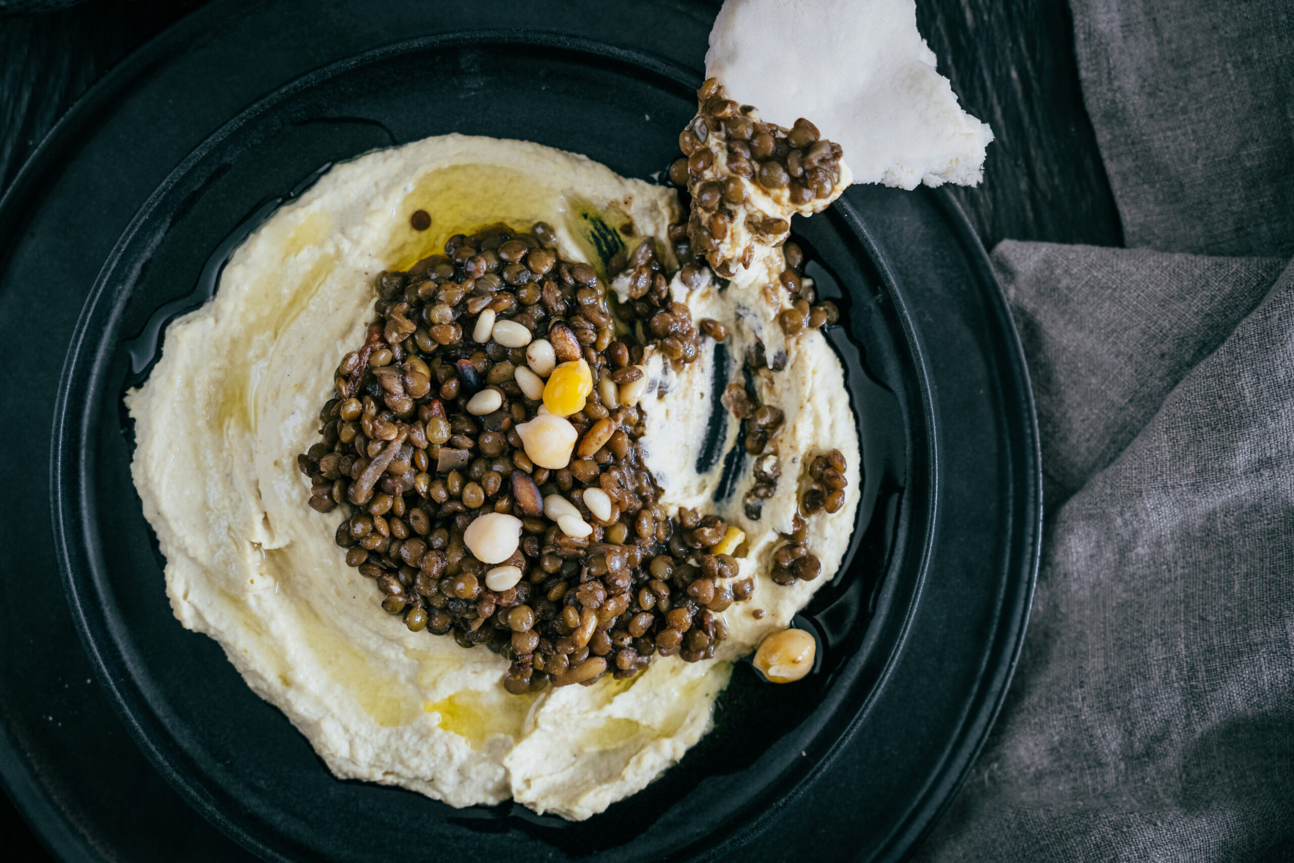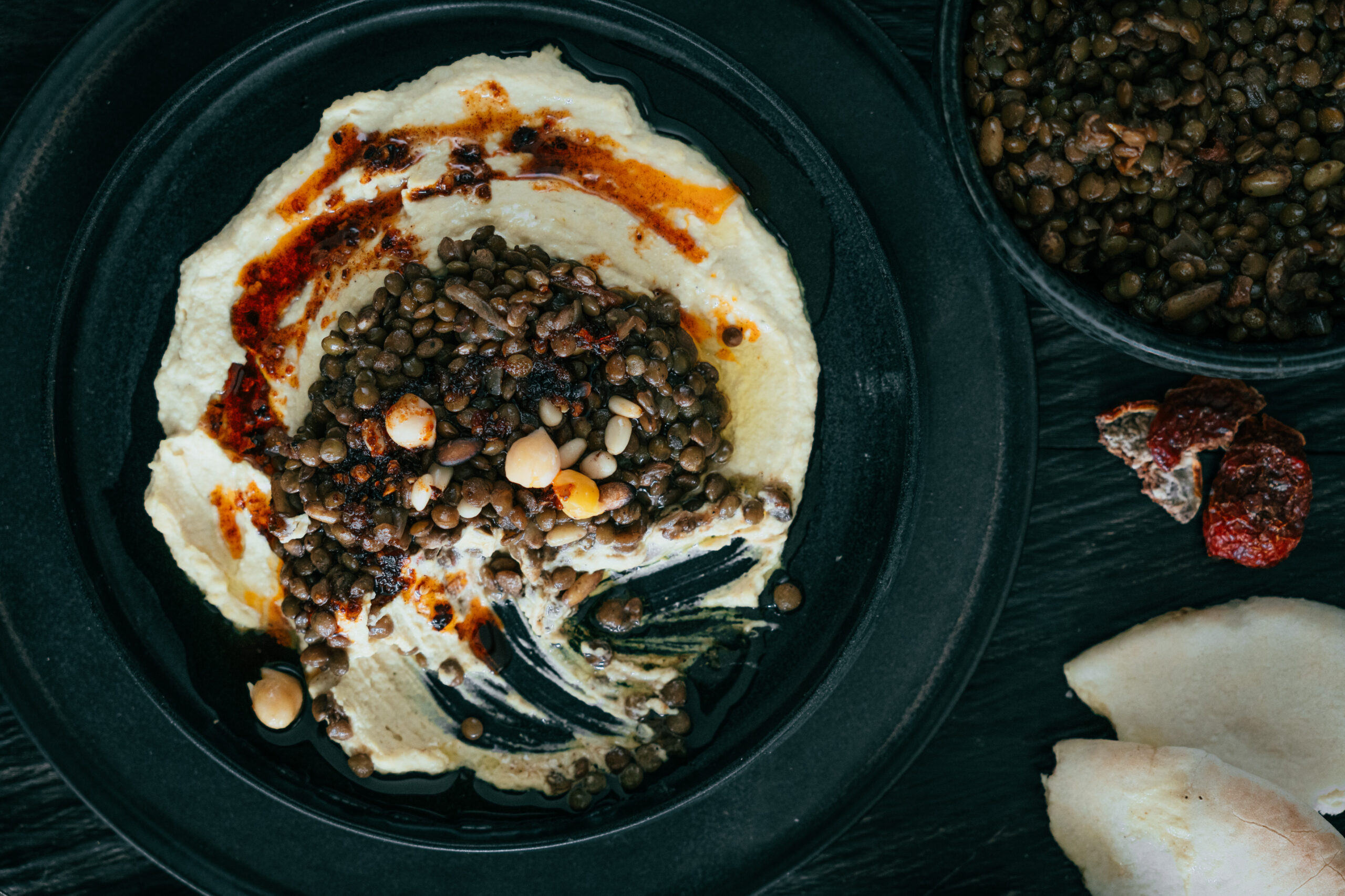 Hummus auf einem Teller ausstreichen. Linsen darauf geben. Mit ganzen Kichererbsen und etwas Chiliöl garnieren. Mit Pita, Fladenbrot oder Brot nach Belieben geniessen.