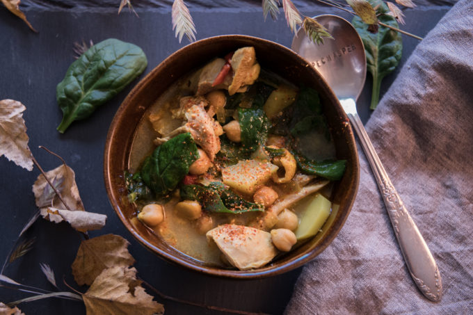 Curry-Kokossuppe mit Huhn, Kartoffeln und Kichererbsen